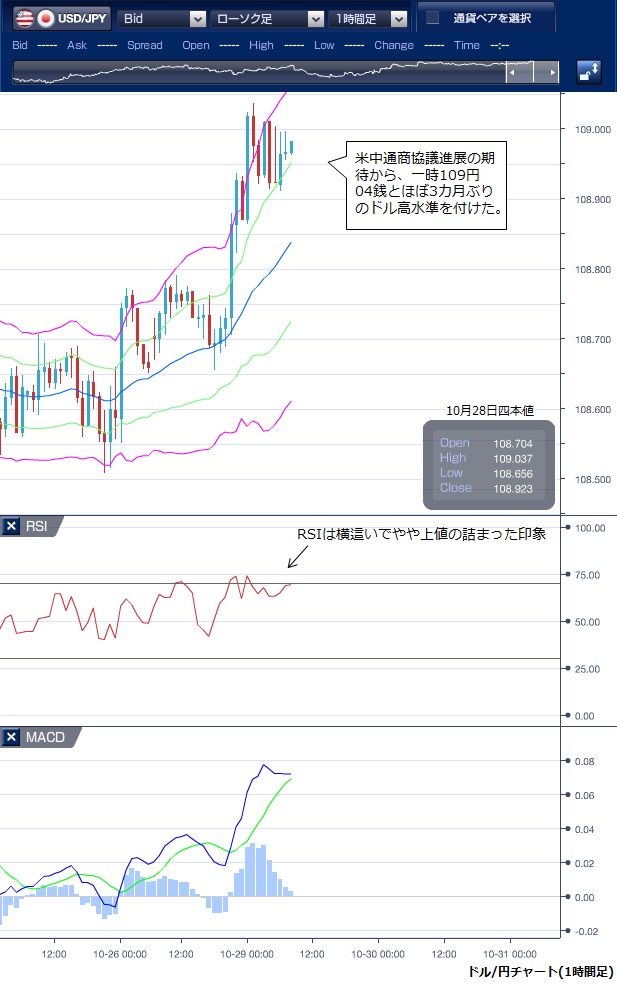 10月28日のドル/円相場は、前週末に「劉鶴中国副首相が、米国のライトハイザー通商代表部(USTR)代表やムニューシン財務長官と電話協議を行い、いくつかの部分について両国の実務的な調整が完了した」と中国商務省が発表したことを受け、ドルが底堅い動きとなりました。 ただし、日米の金融政策決定会合を控え109円手前ではドル売りも厚く、アジアから欧州時間にかけては108円後半での小動きが続きました。 NY時間に入ると、トランプ米大統領が、中国との貿易協議の部分合意について調印に向けた最終調整が「計画より早く進んでいる」と述べたと報じられたことからリスクオンの流れとなり、一時109円04銭とほぼ3カ月ぶりのドル高水準を付けました。 EUが10月末としていた英国の離脱期限を最長で2020年1月末まで3カ月延期することで合意したことも過度な懸念を後退させドル買いにつながったとの指摘もあります。 NY時間の上昇で価格は高値を更新したものの、RSIの高値は横ばいで、ややドルの上値の詰まった印象となっています。 昨日は、200日移動平均で上値を止められた形となっており、この水準をクリアーに上抜いて行けるかが注意目されます。 ※チャートは、ドル/円の1時間足ボリンジャーバンドRSIMACDを表示しています。