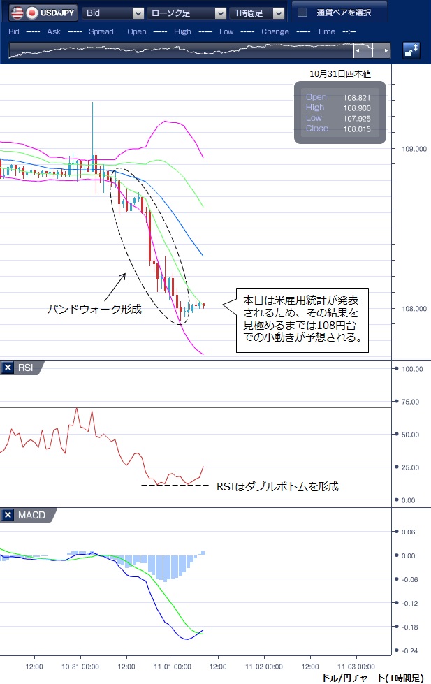 10月31日のドル/円相場は、アジア時間では本邦実需のドル売りや6カ月連続で50割れとなった中国の製造業購買担当者景気指数に押され、軟調な動きが続きました。 日銀の金融政策決定会合では金融政策の現状維持とフォワードガイダンスの修正を決定しましたが、一部の海外投機筋の間では利下げを示唆するニュアンスやマイナス金利の深掘りが期待されていたことから、失望感が強まり、円買いが優勢となりました。 NY序盤には、米メディアが「中国高官が米政府と包括的で長期的な合意に到達できるかを疑問視している」などと報じたほか、シカゴ購買部協会景気指数が43.2と市場予想に反して9月から低下し、ほぼ4年ぶりの水準に低下したことを受け、リスク回避の動きが強まり、一時107円92銭まで下落しました。 NY時間の下落では、ボリンジャーバンドの下抜けとバンドウォークが形成されましたが、RSIを見るとダブルボトムを形成しており、108円割れを売り込む勢いはないことが示唆されています。 本日は、米雇用統計が発表されるため、その結果を見極めるまでは108円台での小動きが予想されます。 米雇用統計では、米自動車大手ゼネラル・モーターズの組合員約4.8万人がストライキを行っていたことによる影響があるとみられることから、非農業部門雇用者数の増加幅減少が見込まれています。 ※チャートは、ドル/円の1時間足ボリンジャーバンドRSIMACDを表示しています。
