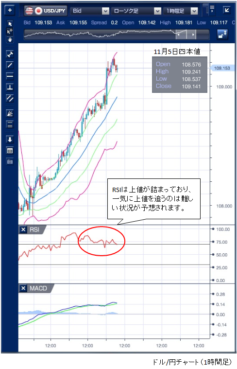 11月5日のドル/円相場は、前日同様ドルが一貫して堅調な足取りを続けました。 通商問題に関する米中閣僚級協議の後、米当局者が月内に「第1段階」の合意に署名する可能性があると明らかにしたことや米政府が9月1日に発動した対中関税の軽減を検討していると一部報道があったことなどを手掛かりに、米中交渉の進展に楽観的なムードが広がったことがその背景にあります。 NY時間に入ると、10月の米サプライマネジメント協会(ISM)非製造業景況感指数が前月比2.1ポイント上昇の54.7と市場予想の53.5を上回ったことから米経済の成長見通しが改善し、年内の金利据え置き観測が広がったことでドル買いが加速、一時109円24銭の高値を付けました。 ドルは109円台にしっかりと乗せてきて200日移動平均を上抜いており、110円を試すことが期待されます。 ただし、短期的には1時間足ベースのRSIの上値が詰まってきており、このまま一気に上値を追えるかどうかは難しいところです。 本日もドルは底堅い動きが予想されますが、上昇速度は緩やかなものとなりそうです。 ※チャートは、ドル/円の1時間足ボリンジャーバンドRSIMACDを表示しています。