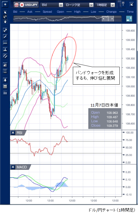 11月7日のドル/円相場は、東京時間は前日の米中通商交渉合意延期の可能性を嫌気した流れを引き継ぎ、ドルが軟調な動きとなりました。 朝方から徐々に軟化し、午後には一時108円65銭の安値を付けました。 その後、ロンドン序盤に「米中が通商協議のフェーズ1で合意できれば、双方が同規模で既存の関税撤廃行うこと合意」と報じられるとムードは一変、ドル買いが優勢となり一気に109円を回復する動きとなりました。 NY時間でもドル買いの流れは継続し、6日の高値を上抜けると損切りのドル買いを巻き込み109円49銭まで上昇しました。 この上昇では、ボリンジャーバンドの上抜けとバンドウォークの形成が確認できます。 ただし、NY引けにかけては、ホワイトハウスの対中関税撤廃計画が米政権内部で強い反対に直面しており、まだ最終的な決定は下されていないと伝わったことで、伸び悩む動きとなり、109円30銭水準で引けています。 ※チャートは、ドル/円の1時間足ボリンジャーバンドRSIMACDを表示しています。