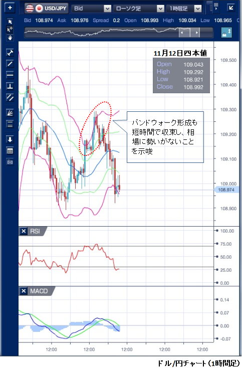11月12日のドル/円相場は、東京から欧州参入時間にかけてはドルが底堅い動きながらも、上値は109円29銭までの小動きとなりました。 109円を割り込むような水準では輸入企業の買いや、これまでにドルを売り込んでいた短期筋の買い戻しが入るものの、先週109円50銭へわずかに届かず反落したことで、109円半ばでは売り需要が強いとの見方が広がったことが上値を抑えていました。 欧州参入時のドル上昇では小さなバンドウォークが確認できますが、短時間で収束しており、相場に勢いがないことが示唆されています。 その後は徐々にドルが軟化する動きとなりました。 特にNY午後にトランプ米大統領がニューヨークエコノミッククラブでの講演で米中貿易協議について「合意に近づいている」と述べたものの、「米国の労働者と企業にとって良い条件である場合に限り取引を受け入れる」とも述べ、新たな情報を発表しなかったことで協議進展への期待がしぼみ、一時108円92銭まで押し戻されました。 本日も昨日同様109円近辺で方向感を探る動きが強そうですが、今夜予定されているパウエルFRB議長の議会証言への注目もあり、昨日以上に模様眺めの動きとなる可能性もあります。 ※チャートは、ドル/円の1時間足ボリンジャーバンドRSIMACDを表示しています。
