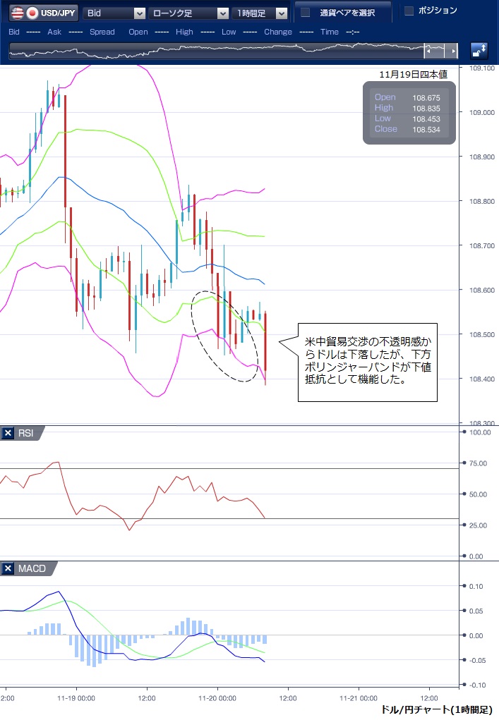 11月19日のドル/円相場は、東京朝方こそ前日の流れを受けドルが軟調に推移し、一時108円47銭まで軟化したものの、その後はドルの買い戻しが優勢となる動き、欧州時間には108円84銭まで値を戻しています。 しかし、NY時間に入ると、一部報道で「発動済みの対中制裁関税をどの程度撤廃するかなど、中国との部分合意の詳細を巡り米政権内で意見が割れている」と報じられたことで米中貿易協議の不透明感が続きドルは再び下落する動きとなりました。 この下落で108円46銭の安値を付けましたが、この水準は下方ボリンジャーバンドが位置しており、下値抵抗となって下支えされています。 昨日も、米中交渉を巡る思惑から方向感のない動きとなり、108円台での小動きが続いています。 本日も同様に108円台での動きが続きそうですが、米中交渉に関するヘッドラインによっては、波乱が起きる可能性もあり注意が必要な状況に変化はないでしょう。 ※チャートは、ドル/円の1時間足ボリンジャーバンドRSIMACDを表示しています。