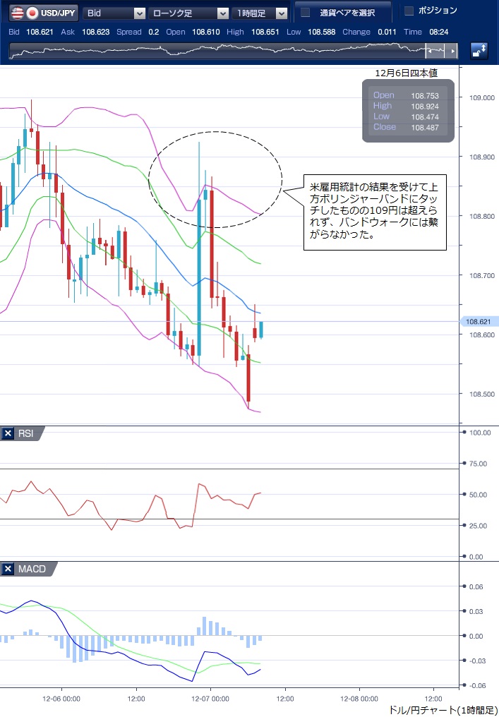 先週末(12月6日)のドル/円相場は、東京から欧州時間にかけては米雇用統計を控え小動きながら、ポジション調整の動きでドルの上値が重い展開が続きました。 注目の米雇用統計では、非農業部門の雇用者数が前月比26万6000人増と市場予想の19万人増を大幅に上回り、失業率も3.5%に低下し、平均時給も前年比3.1%上昇と3%超の伸びを維持しました。 これを受けてドルは急上昇し、一時108円92銭の高値を付けましたが、109円には届きませんでした。 この上昇で上方ボリンジャーバンドにタッチしたものの、バンドウォークにはつながらず、一過性の動きに終わっています。 NY午後になると、15日予定の米の対中制裁関税「第4弾」の全面発動を控え米中通商協議に対する不透明感からドルは軟調に推移し、108円半ばまで押し戻される動きとなりました。 今週は、12日には英総選挙、15日には中国への追加関税の期限とイベントが続き、それに向けた報道などで市場も一喜一憂することになりそうです。 ※チャートは、ドル/円の1時間足ボリンジャーバンドRSIMACDを表示しています。