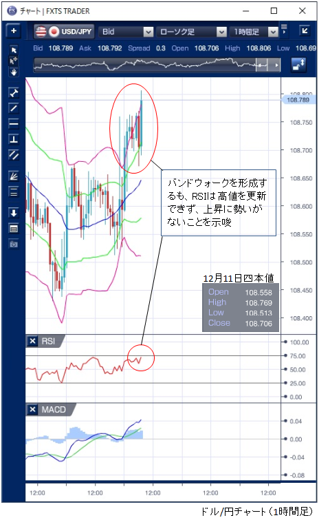 12月10日のドル/円相場は、イベント前の利益確定や調整的な売買以外はほとんどみられず、108円台で方向感が出ない動きが続きました。 東京から欧州時間にかけて108円51銭から66銭の15銭の値幅にとどまりました。 NY時間に入ると、米ウォール・ストリート・ジャーナルが、米中の政府関係者の話として「米中の交渉団が15日に発動する新たな関税を延期する方向で根回ししている」と報じたことで交渉が進展するとの期待が強まり、一時108円76銭の高値を付けました。 この上昇で、小さなバンドウォークの形成が見られましたが値幅は小さく、RSIも高値を更新できず、上昇にも強い勢いがないことを感じさせる形となっています。 日足ベースで見ると、200日移動平均に上値を抑えられていることが確認できます。 本日からFOMCが始まり明日結果が発表、12日には英総選挙とECB理事会、15日の対中追加関税発動期限と重要イベントが目白押しの中で、本日も積極的な売買は期待できないでしょう。 ※チャートは、ドル/円の1時間足ボリンジャーバンドRSIMACDを表示しています。