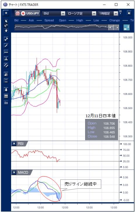 ドル円の前日の為替相場の動きを、各テクニカルで検証します。