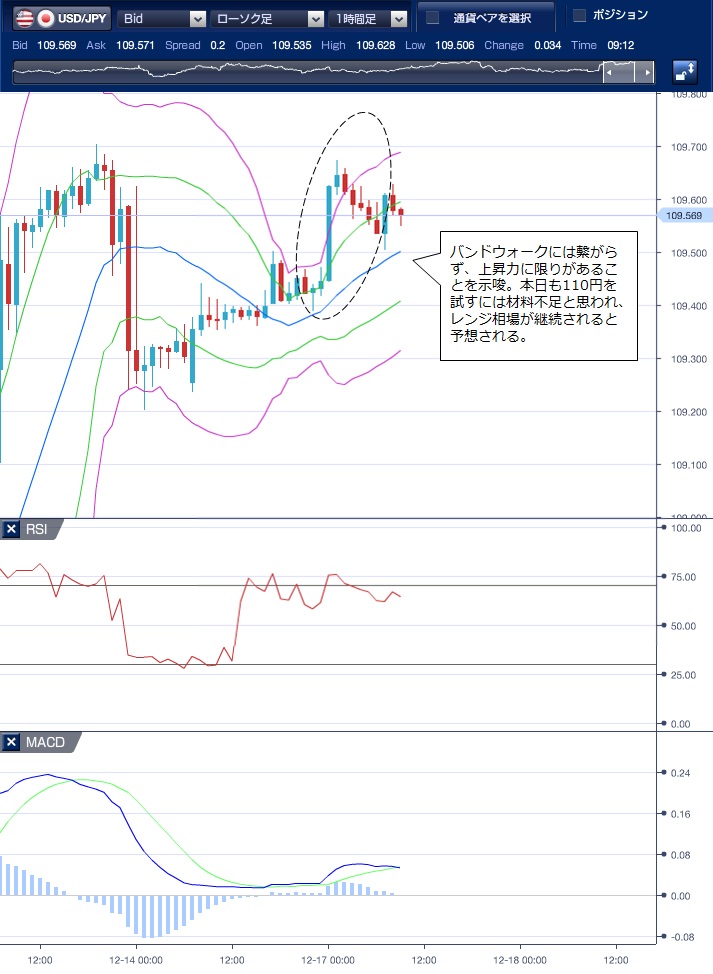 12月16日のドル/円相場は、東京から欧州時間にかけて109円台での狭いレンジ取引が続きました。 前週末に強まった楽観ムードは早くも一服となり、方向感なく揉み合いとなりました。 この間、MACDはゼロ水準でシグナルと重なっており、方向性がないことが示されています。 NY時間に入ると、中国の11月小売売上高と11月鉱工業生産が予想を上回ったほか、米国の12月NAHB住宅市場指数が20年ぶり高水準を記録したことなどを受け、リスクオンの流れとなり一時109円68銭までドルが値を戻しました。 この上昇で、上方ボリンジャーバンドを上抜けましたが、明確なバンドウォークにはつながらず、上昇力にも限りがあることを示唆しています。 本日も109円台で底堅い動きが期待されますが、110円を試すには材料不足のように思われ、レンジ相場継続となりそうです。 ※チャートは、ドル/円の1時間足ボリンジャーバンドRSIMACDを表示しています。