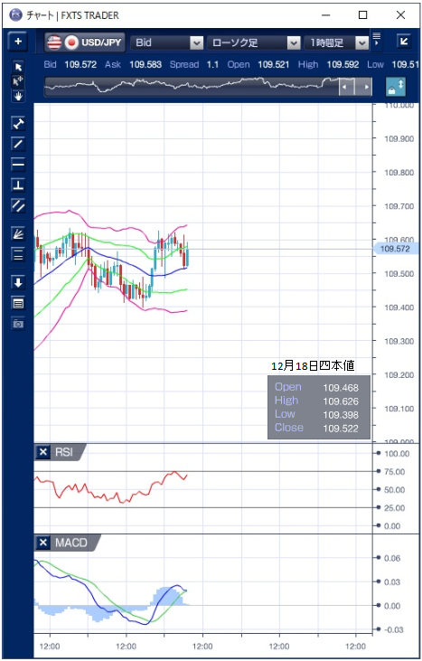 12月18日のドル/円相場は、前日同様109円台の狭いレンジでの推移を続けました。 1日の変動幅は、109円40銭〜109円63銭で23銭、NY時間に至っては109円49銭〜109円63銭でわずか14銭しか動かず、固定相場となったような動きでした。 ドル/円は新たな材料が出てくるまで、現状のレンジ相場継続を想定する市場参加者が多く、より様子見の動きが強まっています。 ※チャートは、ドル/円の1時間足ボリンジャーバンドRSIMACDを表示しています。