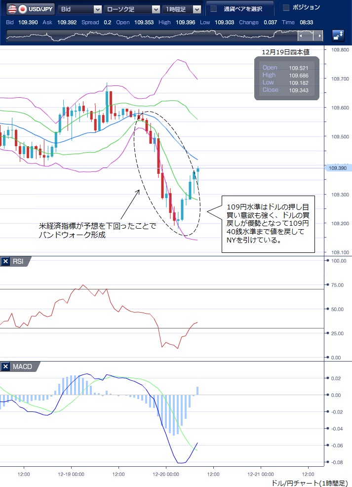 12月19日のドル/円相場は、東京から欧州時間にかけては109円後半で前日同様の小動きが続きました。 ただし、MACDは東京午後には売り転換しており、海外市場でのドル売りを示唆する形となっていました。 NY時間に入ると、12月のフィラデルフィア連銀製造業景況指数は6カ月ぶりの低水準となり市場予想を下回ったことや、11月の米中古住宅販売件数も市場予想より大きく減少したことなどを受けドル売りが優勢となり、一時109円18銭まで下落しました。 この下落では、ボリンジャーバンドの下抜けとはっきりとしたバンドウォークが形成されていることが確認できます。 その後109円水準はドルの押し目買い意欲も強く、ドルの買戻しが優勢となり109円40銭水準まで値を戻してNYを引けています。 ※チャートは、ドル/円の1時間足ボリンジャーバンドRSIMACDを表示しています。
