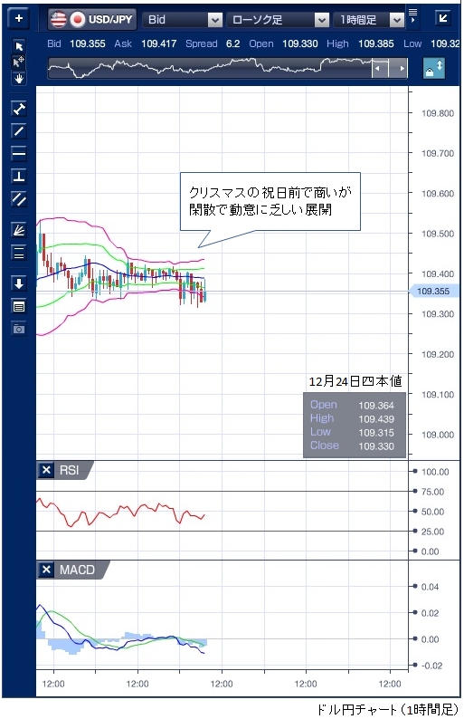 12月24日のドル/円相場は、クリスマスの祝日前で商いが閑散となり、前日終値を挟んで小動きが続きました。 一日を通しての値幅もわずか12銭で、ほぼ動きがない状況といえます。 本日もクリスマスで主要な海外市場が休場となることで動意に乏しい展開が予想されます。 アジア市場でもオセアニア、香港、シンガポールが休場、その後欧州市場、北米市場も休場です。 ※チャートは、ドル/円の1時間足ボリンジャーバンドRSIMACDを表示しています。