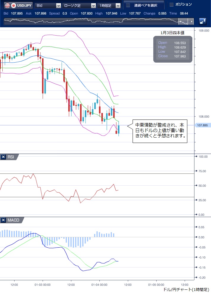 先週末(1月3日)のドル/円相場は、東京が正月休みの中、ドルが軟調な動きとなりました。 米国防総省が2日、トランプ米大統領の指示でイラン革命防衛隊の精鋭組織のカセム・ソレイマニ司令官を空爆で殺害したと発表し、3日にはイランの最高指導者ハメネイ師がツイッターで報復攻撃を警告したことで中東情勢が緊迫化するとの警戒感が高まり、リスクオフでの円買いが優勢となりました。 NY時間では、19年12月のサプライマネジメント協会(ISM)製造業景況感指数が市場予想に反して前月から0.9ポイント低下の47.2と09年6月以来の低水準をつけたため、ドル売りがやや強まる場面があり、昨年10月10日以来約3カ月ぶりに107円台まで押し込まれました。 もっとも、地政学リスクの高まりで、ユーロや英ポンド、一部の新興国通貨や資源国通貨に対して流動性の高い米ドルに資金を移す有事のドル買いも広がったため、ドルは下げ渋り108円水準で週を越えました。 週明けの本日は、再びドル売りが優勢で107円台からスタートしており、中東情勢を警戒してドルの上値の重い動きが続きそうです。 ※チャートは、ドル/円の1時間足ボリンジャーバンドRSIMACDを表示しています。