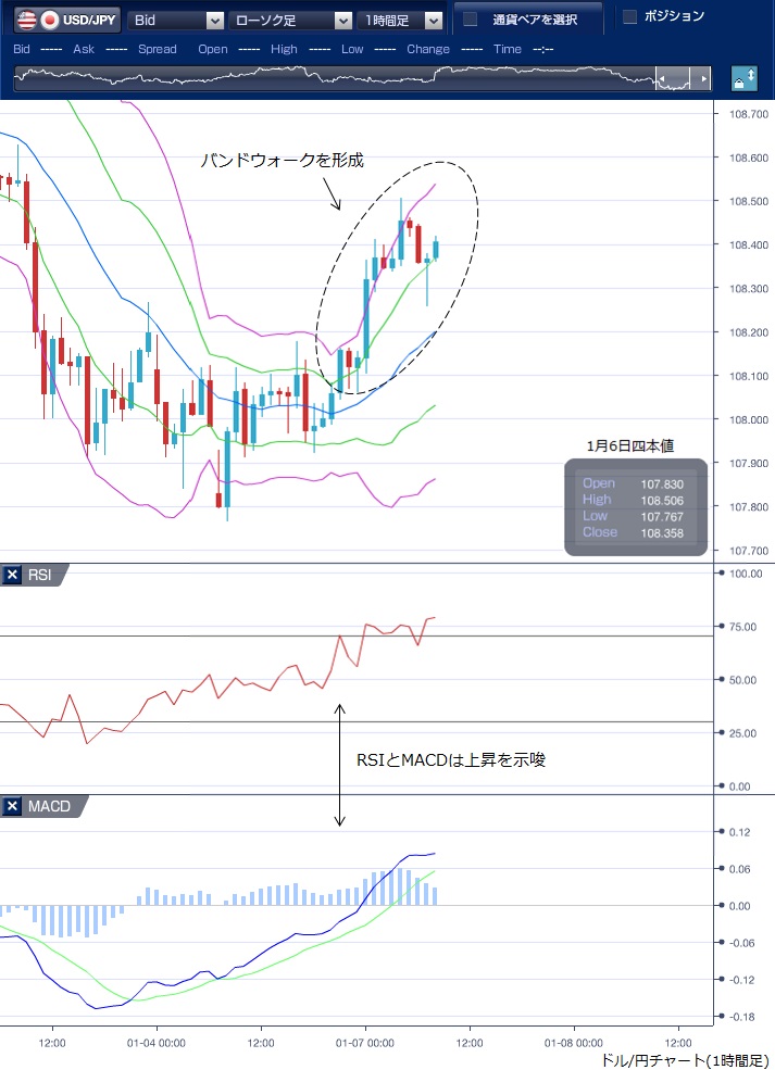 1月6日のドル/円相場は、東京朝方からドル売りが先行、一時107円77銭と、昨年10月10日以来約3カ月ぶりの安値をつけました。 イラン側が近く報復に踏み切る可能性を警戒し、リスクオフの流れが強まったと指摘されます。 しかし、仲値にかけて108円台へ値を戻し、その後は108円近辺での動きが続きました。 NY時間に入っても、中東情勢が悪化するとの懸念が強くドル売りが先行したものの、108円は維持、その後米株安や米長期金利低下が一服して反転したことからドルにも買戻しが入り108円50銭まで値を戻しました。 テクニカルで見ると、MACDは朝方から買いサインを続けており、RSIも上昇基調、NY時間のドル上昇ではボリンジャーバンドの上抜けとバンドウォークが形成されており、相場が年末年始のドル安への調整局面であったことが示唆されていました。 中東情勢への警戒感が続く中、ドルの上値は重い状況が続いているものの、108円台へ値を戻してきたことで底割れのリスクは小さくなったものと思われ、本日も108円台での神経質な取引となりそうです。 ※チャートは、ドル/円の1時間足ボリンジャーバンドRSIMACDを表示しています。