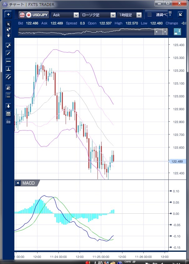 チャートは、ドル/円の1時間足ボリンジャーバンドMACDを表示しています。 昨日のドル/円相場は、前日からの流れを引き継ぎ、終始ドルの上値の重い展開が続きました。 国内勢を中心に動きが鈍く、方向感が出なかったこともあり、感謝祭休暇を控える海外勢の間では、早々とポジションを圧縮する動きが出ていたとの指摘もあります。 海外時間に入ると、11月の米消費者信頼感指数が市場予想の99.5を大きく下回る90.4で、2014年9月以来の低水準だったことでドルに売り圧力がかかるとともに、NATO(北大西洋条約機構)メンバーであるトルコによるロシア機撃墜を受けて、プーチン大統領がトルコを強く非難したため、地政学的リスクが高まり、リスク回避のドル売り、円買いが優勢となって、一時122円31銭まで下落しました。 この流れで、相場はボリンジャーバンドの下抜けを何度か試しましたが、バンドウォークには繋がらず、この下落が強いトレンドを伴ったものではないことが示されています。 MACDを見ても、NYの引けにかけて買い転換しており、目先ドルの下値も堅いことが推測されます。 来週以降に欧州中央銀行(ECB)理事会や米雇用統計、また米連邦公開市場委員会(FOMC)と、年内の注目イベントが相次ぐことから、現状では動きがとりにくいとの指摘もあります。