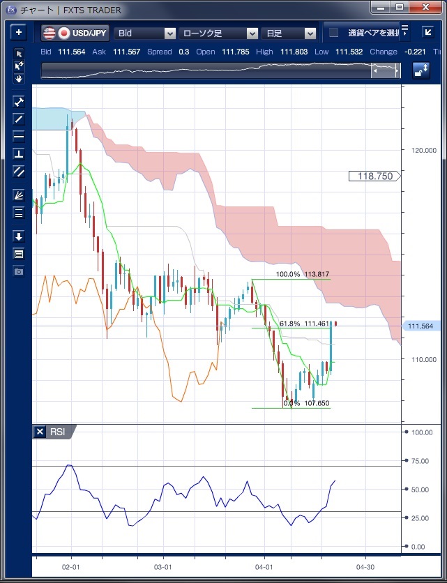チャートは、ドル/円の日足一目均衡表RSIを表示しています。 先週のドル/円相場は、週初は窓を開けて安値で始まるというドル軟調な地合となりました。 しかし、その後は原油価格の反発や株式市場の回復などを受け、徐々に値を戻す動きとなりました。 週後半には、一部通信社が金融緩和策の一環として、日銀内で「金融機関に対する貸し出しに対してもマイナス金利の適用を検討する案が浮上している」と伝えたことで円売りが加速し、金曜日の海外時間では一時111円81銭を付け、4月1日以来3週ぶりの円安・ドル高水準まで上昇し、ほぼ高値圏で週を越えています。 テクニカルで見ると、3月29日から4月11日までの下落幅の61.8%戻しの水準を先週末にはしっかりと超えてきており、全値戻しである113円後半が視野に入ってきます。 もっとも、一目均衡表の先行スパンの雲が112円半ばにかぶさってきており、目先はこの水準を抜けることが出来るかが注目されます。 先週の上昇にもかかわらず、RSIは中立水準を少し上抜けただけであり、もう一段の上昇が期待される形となっています。 今週は、27〜28日に日銀金融政策決定会合があり、景気の先行き不透明感に加え、11日には円が一時107円63銭と約1年5カ月ぶりの円高水準を付けたことで、追加緩和への期待が強くなっています。 また、米商品先物取引委員会が22日発表した通貨先物市場の投機筋による円の買い越しは、最近の円高基調を映して2週続けて過去最大だったこともあり、週末にはポジション調整の円売りも観測されており、その流れは今週も継続される可能性が高いとの指摘もあります。