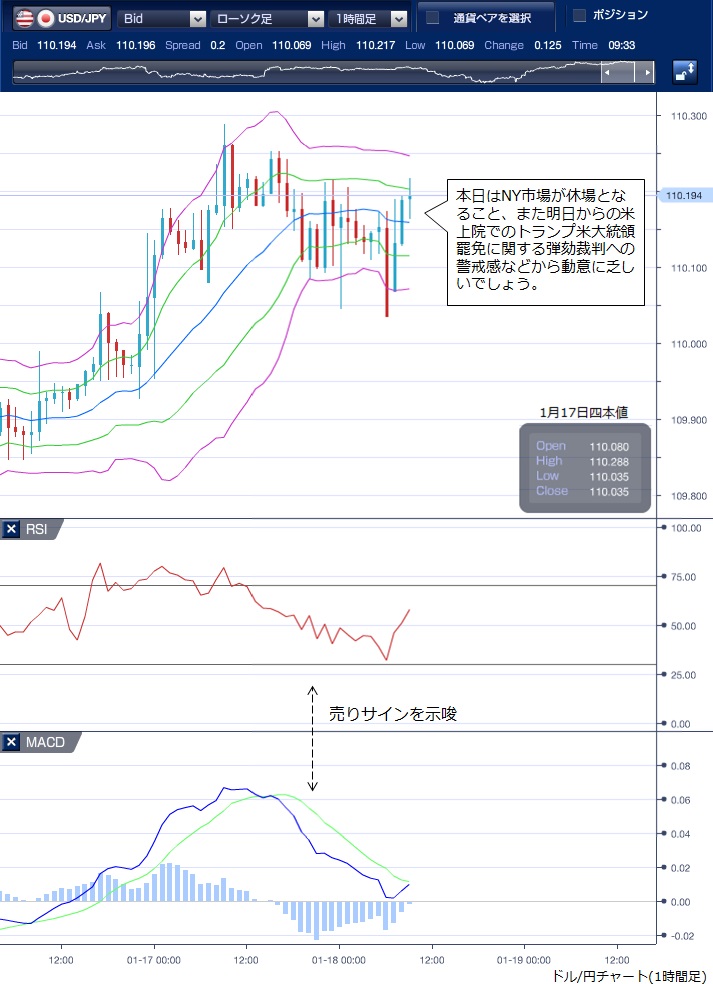 先週末(1月17日)のドル/円相場は、110円台前半で小動きながらも、ドルの上値の重い動きとなりました。 東京朝方こそ、短期投機筋の買いで110円30銭まで上昇する局面もありましたが、その後は米国市場3連休をにらんだポジション調整のドル売りが優勢で、じりじりと値を下げる動きとなりました。 海外市場でも同様の動きが続き、一時110円05銭の安値を付けました。 ただし、NY時間では高値は110円21銭、安値は110円05銭で16銭の値幅と極めて小動きにとどまりました。 テクニカルで見ると、MACDが売りサインを続けており、RSIも右下がりとなっていることからドルの軟調さが窺えますが、ボリンジャーバンドはバンド幅を縮小しており、相場に勢いがないことが示されています。 本日は、NY市場がキング牧師誕生日で休場となること、また明日からの米上院でのトランプ米大統領罷免に関する弾劾裁判への警戒感などから動意に乏しい展開が続く可能性が高いように思われます。 ※チャートは、ドル/円の1時間足ボリンジャーバンドRSIMACDを表示しています。