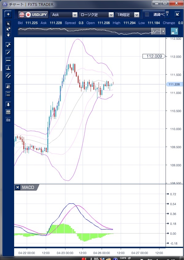 チャートは、ドル/円の1時間足ボリンジャーバンドMACDを表示しています。 昨日のドル/円相場は、前週末にドルが上昇し3週間ぶりの高値となったことを受けて、朝方から利益確定売りや本邦輸出企業の売りが先行する動きとなり、じりじりと111円ちょうど水準まで値を下げました。 この動きでMACDが売り転換しており、その後のドルの上値の重さを示唆する形となっています。 東京午後からは111円を挟んで方向感のない動きが続きました。 また、NY時間に入ると、米国の3月新築住宅販売件数が予想外に減少し、4月ダラス連銀製造業活動指数も予想外に悪化したことに失望したドル売りが優勢となり、一時110円84銭まで下落しました。 もっとも、日本銀行による追加緩和期待を受けた円売りも根強く下値も限定的で、再び111円台を回復してNYを引けています。 ボリンジャーバンドが縮小を続けており、先週末の大きな動きの反動が出ている形となっており目先は膠着した動きとなるのかもしれません。 本日から2日間の日程で始まる米連邦公開市場委員会(FOMC)に関しては、政策変更見送りとの見方が大勢であり、大きな材料にはならないと見られています。