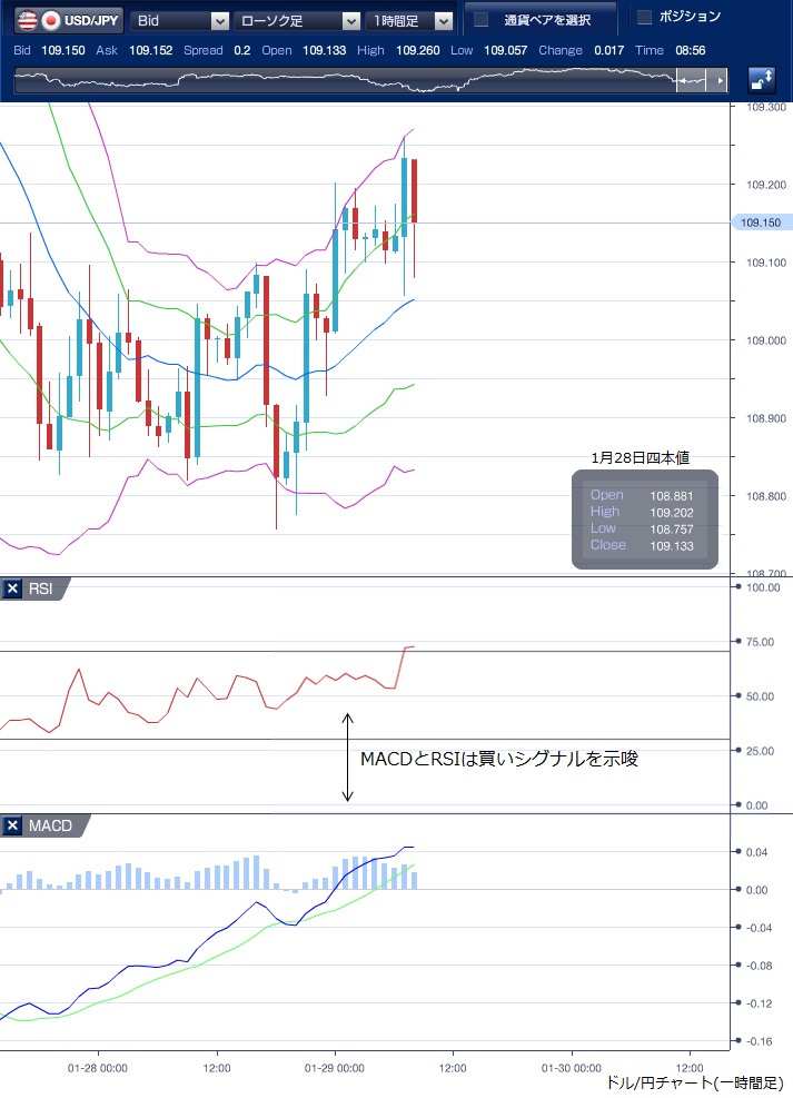 1月28日のドル/円相場は、108円後半から109円前半の狭いレンジ内を上下しました。 東京時間では、下値で輸入企業がドルの手当てに動いたといい、前日につけた3週間ぶり安値水準では下げ渋りが見られました。 欧州時間に再度下押しし、108円75銭まで下落する局面もあったものの、NY時間に入ると、ドル買戻しが優勢となりました。 1月の米消費者信頼感指数が昨年8月以来の高水準となり、昨年11月のケース・シラー住宅価格指数も前年同月比で市場予想を上回って上昇したことがドル買い要因となりました。 また、NYダウが6営業日ぶりに反発したこともドル買いにつながりました。 テクニカルで見ると、前日の海外市場で>、MACDが買い転換して以降、買いサインを続けており、RSIも緩やかに切り上がっていることから、ドルの下値が堅いことが示唆されていました。 昨日は109円台を回復してNYを引けていますが、新型肺炎を巡る状況を慎重に見極めたいという市場関係者は多く、上値も限られそうです。 本日も109円中心の小動きが予想されます。 ※チャートは、ドル/円の1時間足ボリンジャーバンドRSIMACDを表示しています。