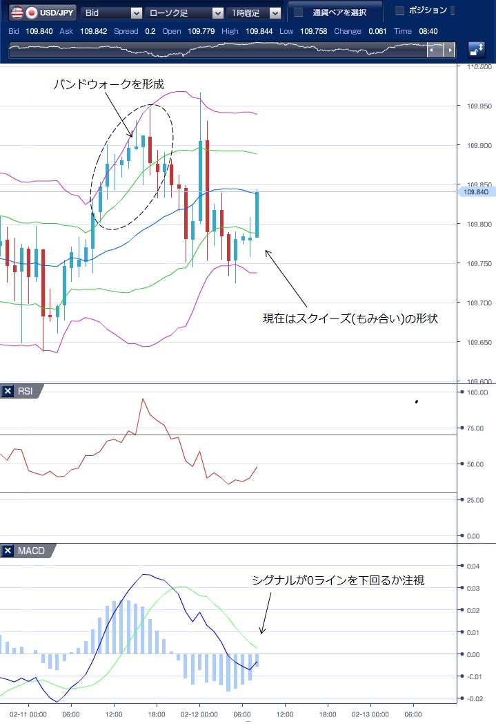 昨日(2月11日)のドル円相場は、109.72円〜109.96円の狭いレンジで方向感なく推移しました。 東京市場では建国記念の日で休場であったことや、パウエルFRB議長の議会証言を控えていたことで終始小幅な動きとなりました。 欧米市場でもドル円は方向感なく推移しました。新型コロナウイルスの死者数が1000人を超えたことから警戒感が高まったもののマーケットは反応せず、パウエルFRB議長が議会証言で米国経済が良好であるとの発言したことで、米国株相場が史上最高値を更新し、ドル買いとなり109.96円まで反発しています。しかし、パウエルFRB議長が新型コロナウイルスの感染拡大が米国にも何らかの影響を受ける公算が極めて大きいと言及するとドル売りが強まり、109.72円まで反落しました。 テクニカルでは(ドル円1時間チャート)、東京時間にバンドウォークから始まったものの、17時以降の下落によって継続できず、スクイーズとなってもみ合いの形成となっています。なお、現在はMACDのシグナルが0ライン近辺まで下落しており、0ラインを下回るかどうかに注視したい。 本日(2月12日)のドル円相場は、新型コロナウイルスの感染拡大を巡り、楽観的・悲観的な報道が錯綜していることで上値が重い展開が予想されます。主だった指標発表も予定されていないことから110円を上抜けていくのは難しく、109円後半の水準を保てるかが注目されます。 ※チャートは、ドル/円の1時間足ボリンジャーバンドRSIMACDを表示しています。