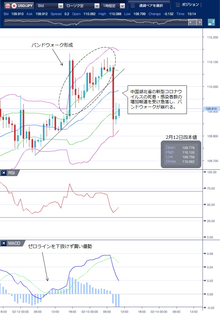 昨日(2月12日)のドル円相場は堅調に推移し、1月20日以来の3週間ぶりに110円台でNYクローズとなりました。 東京市場のドル円は、特に材料もなく109円後半で小動きとなりました。 欧州市場に入ると、中国での新型肺炎の感染拡大の勢いが弱まりつつあるとの見方から欧米株が上昇し、ドル買い優勢となり、ドル円は3週間ぶりの高値となる110.13円まで上昇しました。その後は、利益確定や実需のドル売りが入り109.91円まで反落したものの、NY市場では再び110円台を回復し、堅調に推移しました。 テクニカルでは(ドル円1時間チャート)、欧州勢参入後の上昇でバンドウォークが形成されたことや、MACDのシグナルが0ラインを割れずに上昇していることから、買い優勢の形状となりました。 本日(2月13日)のドル円相場は、109円後半から110円前半のもみ合いになると考えています。 8時30分過ぎに中国河北省が「新型コロナウイルスの死者が242人、感染者が1万4,840人に増加」と発表したことを受け、ドル円が109.80円まで近辺まで急落しました。 これを受け、テクニカルでは、バンドウォークが崩れたため、2月13日10時25分現在、もみ合いの形状となっています。 ※チャートは、ドル/円の1時間足ボリンジャーバンドRSIMACDを表示しています。