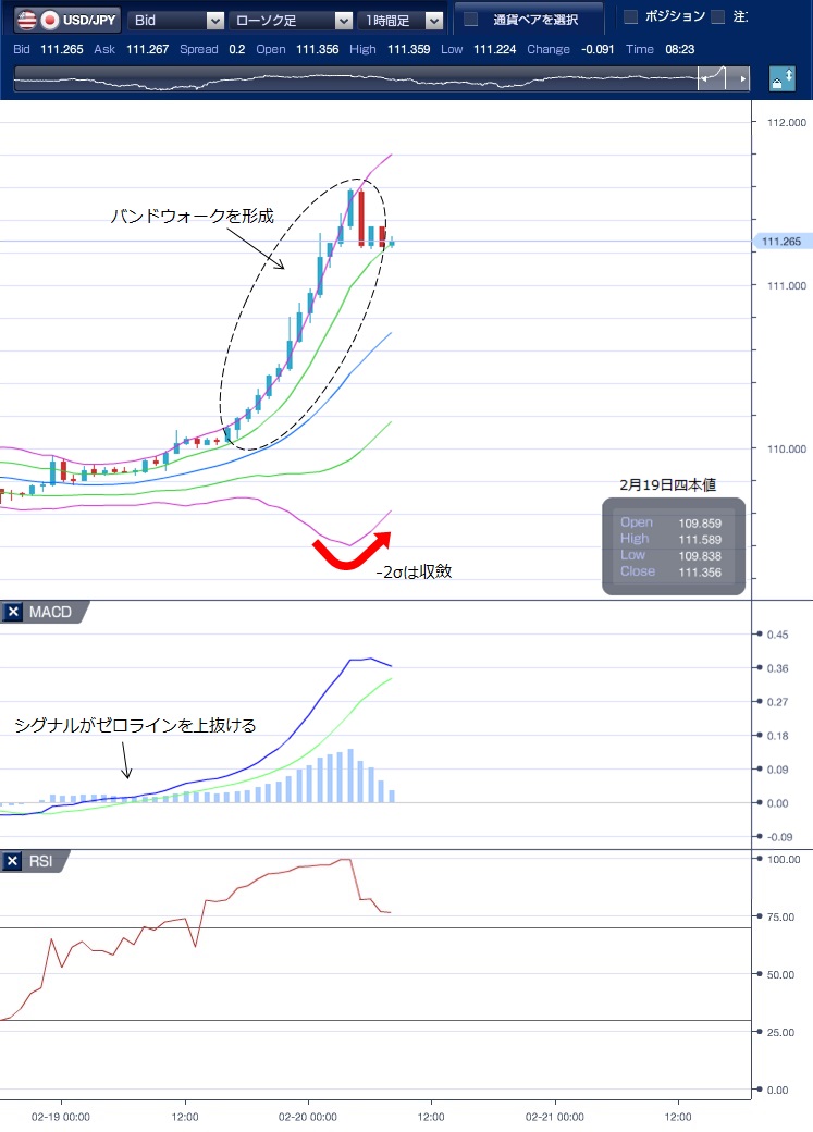 昨日(2月19日)のドル円相場は急伸し、2019年5月3日以来、約10カ月ぶりに111.589円の高値をつけました。 東京市場のドル円は、2月13日高値と面合わせとなる110.11円まで上昇したものの、上抜けできず、午後は110.02円から110.07円と非常に狭いレンジで推移しました。 欧州市場に入ると、欧州株や米株高観測を背景にリスクオンとなり、ドル買いが加速し、110.30台まで上昇しました。 その後、NY市場に入ると中国で新型肺炎感染者の増加ペースが鈍化した報道や米国の経済指標(1月住宅着工件数・1月生産者物価指数(PPI))が軒並み予想を上回る好結果となったことを背景にリスクオンからドル買いが加速し、ストップロスを巻き込み、111.589円まで急騰しました。111.50円台は、2019年5月3日以来、約10カ月ぶり。 テクニカルでは(ドル円1時間チャート)、2月13日高値の110.11円、2月12日高値110.133円を上抜け、ボリンジャーバンドがバンドウォークを形成し、強い上昇トレンドを形成しました。10時現在は-2σが収斂してきているため、上昇一服の形状となっております。 下値の目途は、111.10円その下が110.80円近辺と考えています。 本日のドル円相場はもみ合いになるか、もう一段上を試すか注視したい。 ※チャートは、ドル/円の1時間足ボリンジャーバンドRSIMACDを表示しています。