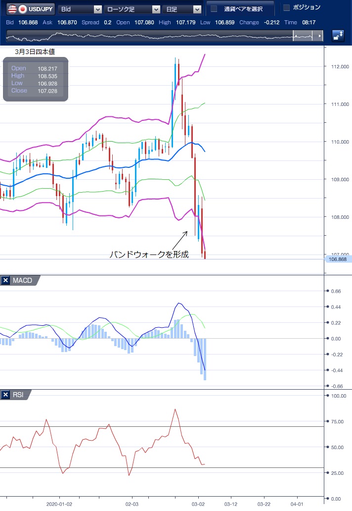 昨日(3月3日)のドル円相場は、FRB(米連邦準備理事会)による緊急利下げを受け、昨年10月8日以来となる、約5カ月ぶりの安値106.92円を記録しました。 東京市場のドル円は、新型コロナウイルスに対し、世界各国中銀による協調緩和の期待感から9時前に108.53円まで上昇しましたが、前日高値の108.58円が上値目途として意識されると失速、13時30分前には107.66円まで下押しています。 欧州市場のドル円は、G7財務省・中央銀行総裁緊急電話会議後の声明発表を控え、107円台後半で方向感なく推移しました。 NY市場のドルは反落。G7財務省・中央銀行総裁が新型コロナウイルスの感染拡大に伴う景気下振れリスクに対して「あらゆる適切な政策手段を用いる」と発表すると市場では「具体策に乏しい内容だった」と受け止められ、失望感からドル売りが先行しました。 また、FRBが臨時のFOMC(米連邦公開市場委員会)を開き、政策金利を1.5%-1.75%から1.0%-1.25%まで引き下げたことが伝わると、一時380ドル超上昇したNYダウが1000ドル近く下落し、米10年債利回りも一時0.904%と過去最低水準を更新したことを受け、ドル円は約5カ月ぶりとなる安値106.92円を記録し、107.02円でNYをクローズしています。 テクニカル(ドル円日足チャート)では、ボリンジャーバンドがバンドウォークを形成しており、強い下落トレンドが継続していることがわかります。 本日はドル円が107円水準を維持できるか、このまま続落することになるか注視したい。 22時15分の米ADP雇用統計、24時の米ISM非製造業景況指数の結果にも注目です。 ※チャートは、ドル/円の日足ボリンジャーバンドRSIMACDを表示しています。