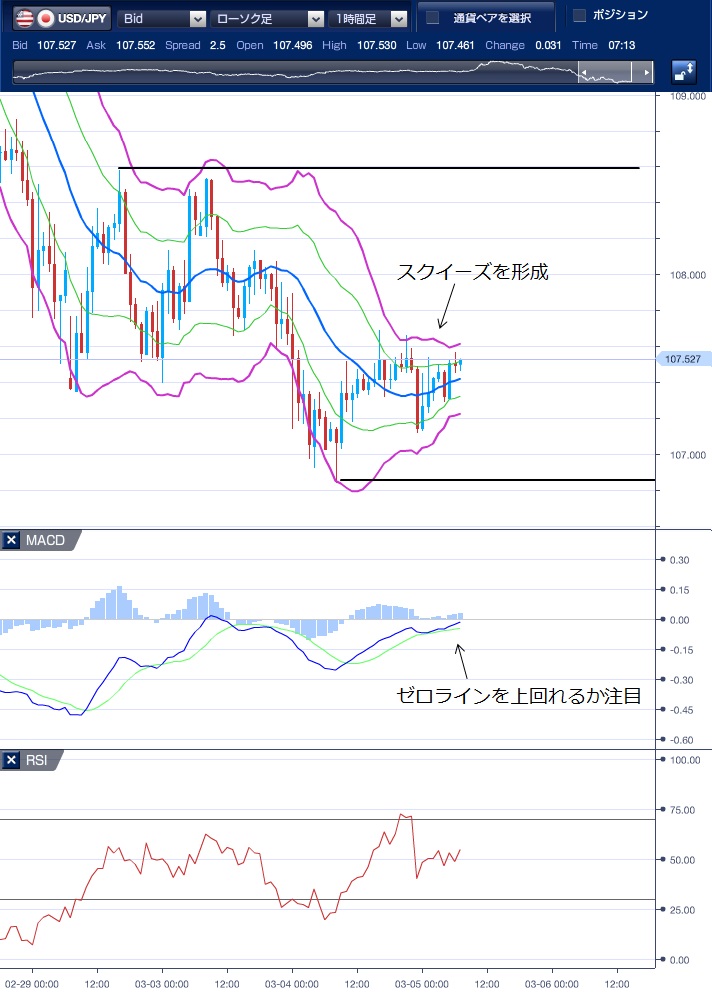 昨日(3月4日)のドル円相場は、107円台で方向感なく推移しました。 東京市場のドル円は朝方安く始まったものの底堅く推移。前日のFRB(米連邦準備理事会)によるサプライズ的な緊急利下げからドル売りが先行し、8時半頃には106.84円まで下落しましたが、106円台ではドル買いの意欲も強く、日経平均株価の下げ渋りを背景に107円前半で底堅く推移しました。 欧州市場のドル円もドル買い優勢。米大統領選の民主党候補指名争いで、中道派のバイデン前副大統領が躍進したことを受け、時間外のダウ先物が一時740ドル超高まで上昇し、米10年債利回りも上昇に転じたことからドル買い優勢となり、ドル円は昨日の高値となる107.68円をつけました。 NY市場に入るとドル円は方向感なく推移。米ADP雇用統計や米ISM非製造業景況指数が予想を上回る結果だったにもかかわらず市場の反応は限定的で、欧州市場でつけた高値107.68円を上回ることができませんでした。 今月17-18日に開かれるFOMC(連邦公開市場委員会)でFRBが追加緩和を決断するとの観測が相場の重石になったとの指摘もあります。 テクニカル(ドル円一時間足チャート)では、ボリンジャーバンドがスクイーズを形成しており、相場に方向感がないことが示唆しています。 本日のドル円は、明日に米雇用統計を控えていることもあり、上値追いには慎重な動きとなりそうなものの、現状の107円水準で底堅く推移できるか注視したい。 また、MACDとシグナルがゼロライン付近で推移しており、上抜けられるかにも注目です。 ※チャートは、ドル/円の一時間足ボリンジャーバンドRSIMACDを表示しています。