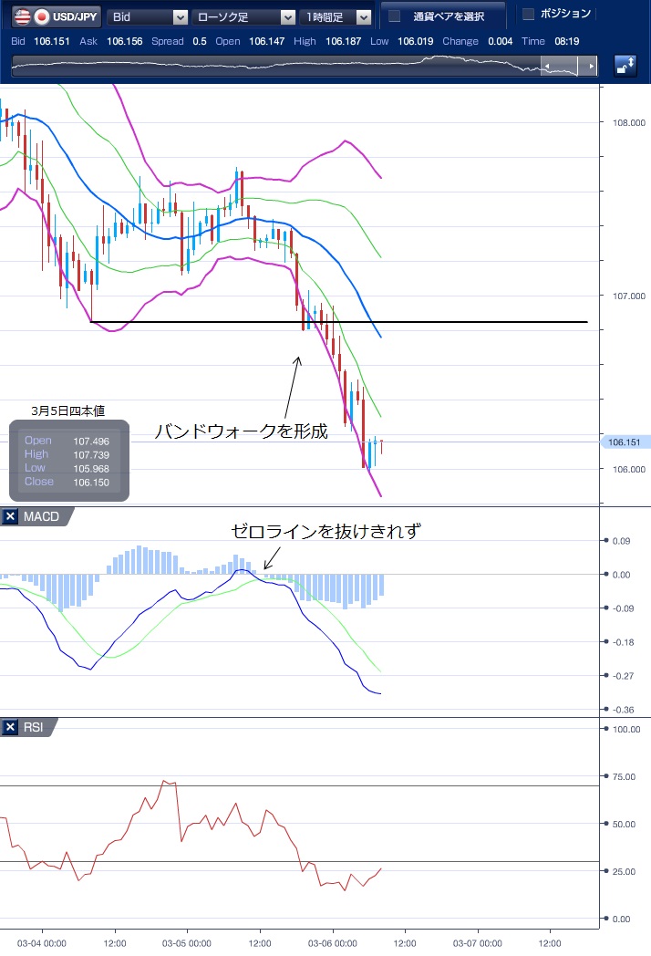 昨日(3月5日)のドル円相場は、終始軟調に推移し、昨年9月4日以来、約半年ぶりとなる安値105.96円を記録しました。 東京市場のドル円は上値が重い展開となりました。 前日に米国株が大幅高になったことで日本株高が見込まれるなか、前日高値の107.68円を上抜け昨日高値の107.73円まで上昇したものの、新型コロナウイルスの感染拡大による世界経済後退の懸念からドル売りが強まり、107.19円まで下落しました。 欧州市場のドル円も軟調に推移。時間外のダウ先物や欧州株、日経平均先物が軟調に推移するなか、ドル円はさらに売られて106.79円まで下げ幅を広げました。 NY市場に入るとドルは急落。新型コロナウイルスによる米景気悪化懸念からダウ平均が一時1100ドル超下落し、米10年債利回りが一時0.8976%と過去最低水準を更新すると、リスク回避の円買いが強まり、ドル円は昨年9月4日以来、半年ぶりとなる安値105.96円を記録しました。 米カリフォルニア州で感染者1名の死亡を受けて非常事態宣言が表明されたほか、ワシントン州での死者数が2桁に達し、ニューヨーク州では感染者数が22名と一晩で倍増したことが明らかになっています。 テクニカル(ドル円一時間足チャート)では、朝方にMACDとシグナルがゼロラインの上抜けを試しにいったものの抜けきれず、ドル買いに勢いがなかったことを示唆しています。 ボリンジャーバンドはバンドウォークを形成していたものの、現在(3月6日8時時点)は-2σより上の水準で推移しており、RSIも下げ止まっていることから、106円水準を維持できるかに注目です。 本日はこのままドルが続落するかが注目されます。 今夜22時30分には注目の米雇用統計が発表されますが、非農業部門雇用者数(予想: 17.5万人)や失業率(予想:3.6%)が予想値を下回った場合には米景気後退の懸念が強まり、今月17-18日のFOMCでFRBによる追加緩和懸念が高まることからドル売りは加速するでしょう。 ※チャートは、ドル/円の一時間足ボリンジャーバンドRSIMACDを表示しています。