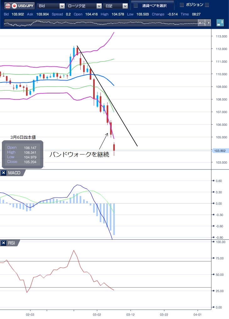 先週末(3月6日)のドル円相場は続落し、一時105円を下割れ、昨年8月26日以来となる安値104.97円を記録しました。 東京市場のドル円は上値が重い展開となりました。本邦輸入企業からドル買いが観測されて一時106.34円まで上げましたが、新型コロナウイルスによる世界経済後退懸念からダウ先物がマイナス圏に沈み、日経平均株価が710円下落したことでドル売りが優勢となって105.75円まで下落しました。 欧州市場のドル円も軟調に推移。時間外のダウ先物や日経平均先物が急落した影響を受けてリスク回避のドル売りが先行し、一時104.99円まで下げ幅を広げました。 NY市場のドル円は105円前半で方向感なく推移。22時30分に発表された米雇用統計は非農業部門就業者数が27.3万人増と市場予想の17.5万人を大幅に上回り、失業率も3.5%と前月の3.6%から低下しています。雇用統計の数字は米景気が好調なことを示しましたが、新型コロナウイルスの影響が反映されていないことから市場の反応は限定的でした。 雇用統計の発表直後には昨年8月26日以来の安値となる104.97円を記録したものの、その後ドルは買い戻され、105円台前半で方向感なく推移し、105.20円で週を越しています。 テクニカル(ドル円日足チャート)では、ボリンジャーバンドによるバンドウォークが継続しており、強い下落トレンドが継続していることを示唆しています。 本日のドル円は窓を開けてスタートし、104.41円の安値を付け、現在(3月9日8時時点)では103.50円と2016年11月9日以来の安値まで下落しています。 本日はこのままドルが続落するのか、窓を開けた分を埋めに行き、105円台まで回復できるのかに注目しています。 ※チャートは、ドル/円の一時間足ボリンジャーバンドRSIMACDを表示しています。