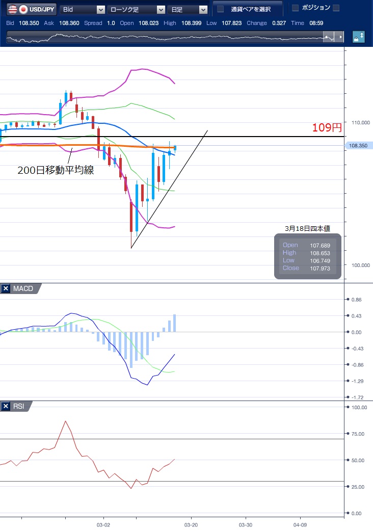 昨日(3月18日)のドル円は続伸し、一時108.65円まで上値を広げました。 東京市場のドル円はドル売りが優勢。日経平均株価が300円超高から失速したほか、米長期金利が低下したことなどからじり安の展開となり、一時106.74円まで下落しました。 欧州市場のドル円は、米10年債利回りの上げ下げに振られながら、107円半ばで方向感なく推移しました。 NY市場ではドル買いが優勢。新型コロナウイルスの感染拡大を受けた金融市場の混乱で投資家のリスク回避姿勢や信用縮小が強まるなか、資金の現金化に伴うドル需要が高まり、ドル円は108.65円まで上昇しました。 引けにかけて小反落するも下値は堅く、107.97円でNYをクローズしています。 NYダウは一時2300ドルを超す急落となり、今月4回目となる「サーキットブレーカー(取引の一時停止)」を発動しましたが、為替市場への影響は限定的でした。 テクニカル(ドル円日足チャート)では、ドルの底堅い動きが続くものの上値が重い印象で、心理的な節目となる109円を上抜くことができておりません。 本日のドル円は続伸できるかに注目です。 現在の価格帯は、200日移動平均線の水準で推移しており、上抜けることができるのか、抵抗帯として機能するのかにも注目しています。 ※チャートは、ドル/円の日足ボリンジャーバンドRSIMACDを表示しています。