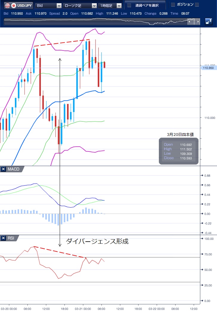 先週末(3月20日)のドル円は4日連続の高値更新となり、2月24日以来の高値111.50円を記録しました。 東京市場のドル円は、春分の日で薄商いのなか、ザラ場ベースでは前日のドル高の流れが続き、111.36円の高値をつけました。 ただしその後は、利益確定のドル売りによって109.30円まで反落しました。 欧州市場ではドル買いが優勢。東京市場から続いていたドル売りが一服したことや、ポンド円や豪ドル円の上昇に下支えされ、110.27円まで下げ幅を縮小しました。 NY市場に入るとドル買いは加速。新型コロナウイルスの感染拡大を防ぐために、カリフォルニア州やニューヨーク州などが相次いで出勤禁止令を出したことで、一時は440ドル超上昇していたNYダウが990ドル超下落しました。 また、WTI原油先物価格が一時22%超急落し、2002年2月以来18年ぶりに20ドルを割り込んだことが意識されると、リスク回避によるドル高が進み、2月24日以来の高値111.50円を記録しました。 その後は、ポジション調整によるドル売りが入り、110.59円でNYをクローズしています。 テクニカル(ドル円一時間足チャート)では、価格が高値を更新するなかでRSIは上げ切れておらず、その後の反落を示唆する形になっていました。 本日のドル円は、5日連続で続伸となるかに注目しています。 投資家のリスク回避姿勢や信用縮小が強まっており、株式や原油など、リスク資産の現金化に伴うドル需要は高く、心理的な節目となる112円をトライしていくのかに注目です。 ※チャートは、ドル/円の一時間足ボリンジャーバンドRSIMACDを表示しています。