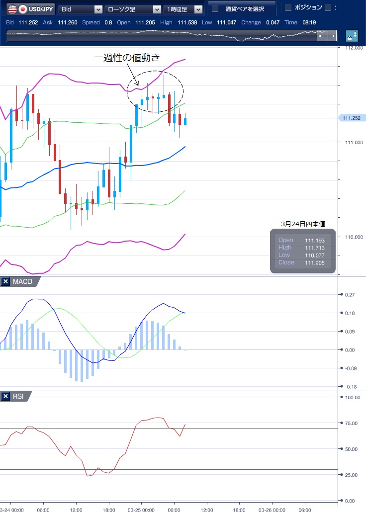 昨日(3月24日)のドル円は米景気刺激策が議会通過するとの期待から続伸し、一時111.71円と2月21日以来の高値を記録しました。 東京市場のドル円は軟調に推移。年度末を控えた本邦輸出企業によるドル売りやレパトリ(海外収益の本国送金)などを受け、朝方につけた111.24円から110.07円まで下落しました。 ただし、110円を割れずに下げ渋ると、その後は110円前半から110円半ばのでもみ合いとなりました。 欧州市場でもドル円は底堅く推移し、NY市場に入ると反発。 新型コロナウイルスの感染拡大への対策として検討されている2兆ドルの米景気刺激策の議会通過が近いとの期待から、NYダウが2112ドル上昇し過去最大の上げ幅を記録するとドル買いが優勢となり、2月21日以来の高値となる111.71円をつけました。 2月米新築住宅販売件数や3月米リッチモンド連銀製造業景気指数が市場予想を上回ったこともドル買いの追い風となりました。 しかし、世界中で株高が進むなか、金融市場の混乱に伴うドル需要が和らいだとの見方から引けにかけては上げ幅を縮め、111.20円でNYをクローズしています。 テクニカル(ドル円一時間足チャート)では、値動きがボリンジャーバンドの値幅内で推移しており、NY市場ではアッパーバンドにタッチしたもののヒゲだけにとどまり、111円後半では上昇力に勢いがないことがわかります。 ドル円は6日連続で続伸しているものの、111円後半では上値が重く、上げ幅も徐々に縮小しています。本日は、ドル高の流れが一服となるのか、続伸して112円にトライするのかに注目です。 ※チャートは、ドル/円の一時間足ボリンジャーバンドRSIMACDを表示しています。