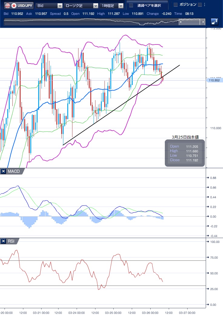 昨日(3月25日)のドル円は前日の高値を上回ることができず、7日連続での続伸とはなりませんでした。 東京市場のドル円は、年度末を控えた本邦輸出企業によるドル売りやレパトリ(海外収益の本国送金)などを受け、朝方につけた111.53円から110.75円まで下落しました。 しかし、米議会で新型コロナ景気対策法案が合意したとの報道が伝わるとドル買いが優勢となり、111.49円まで反発しました。 欧州市場のドル円は軟調に推移し111.06円まで下落したものの、111円を前に下げ渋るとNY市場に入り反発しました。 米議会で景気刺激策が合意されたことが好感され、米耐久財受注が市場予想を上回ったことなども支援材料となり、ドル円は昨日の高値となる111.68円まで上昇しました。 ただし、前日につけた高値111.71円がレジスタンスとして意識されると伸び悩み、111.18円まで押し戻されてNYをクローズしています。 テクニカル(ドル円一時間足チャート)では、値動きがボリンジャーバンドのなかで推移しており、バンドが横這いから収斂していることから方向感に乏しいことがわかります。 ドル円は111円後半で上値を抑えられる展開が続いていますが、本日は昨日の流れを引き継いで方向感なく推移するのかに注目です。 また、ドル円は資産現金化需要や米景気刺激策に対する期待感から底堅く推移していますが、今後は材料出尽くしによる反落リスクにも警戒する必要があるでしょう。 ※チャートは、ドル/円の一時間足ボリンジャーバンドRSIMACDを表示しています。