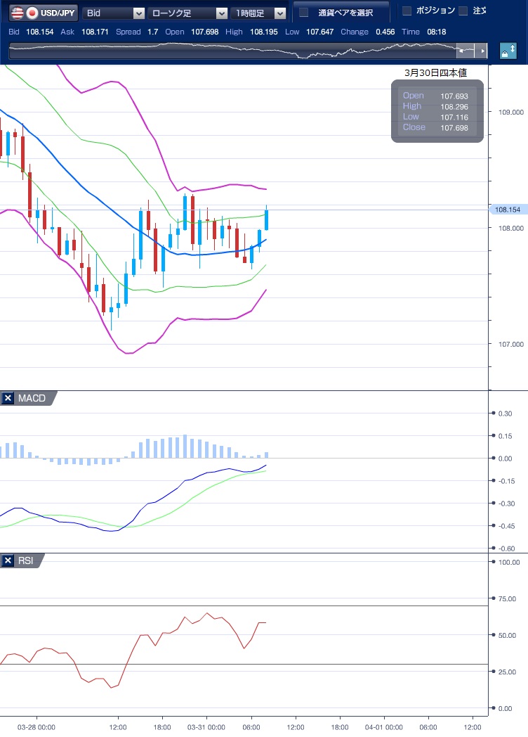 昨日(3月30日)のドル円相場は、107円前半まで下落後に108.円前半まで買い戻され「往って来い」の展開となった後、108円を挟んで方向感なく推移しました。 東京市場のドル円は107.69円で寄り付いた後、新型コロナウイルスの感染拡大による世界経済の減速懸念が嫌気されるなか、早朝からドル売りが強まり一時107.11円まで下落しました。 しかし、107円前半ではドル買い意欲も強く、NYダウ先物が660ドル超安から380ドル超高まで反発するとドルは買い戻され、108.24円まで上昇しました。 欧州市場に入ると、NYダウ先物や欧州株が下落し、小池百合子東京都知事が20時より緊急記者会見を行うと報道されたことが警戒され、ドル円は107.48円まで下押ししました。 ただ、欧州株が持ち直すことで徐々にドル買いが優勢となり、警戒されていた小池百合子都知事の記者会見でサプライズが見られなかったことからドル買い優勢となり108.29円と昨日の高値をつけました。 NY市場は108円を挟んで方向感なく推移し、オープンレートと同水準である107.69円でNYをクローズしています。 テクニカル(ドル円一時間足チャート)では、ボリンジャーバンドは横這いから収斂しており、相場に方向感がないことを示しています。 また、MACDは12時頃に買い転換後に上昇しており、シグナルとともにゼロラインを上抜けることができるかに注目です。 本日のドル円は、昨日と同様に方向感なく推移するのかに注目しています。 また、東京市場では月末・期末を迎えたことで、仲値公表後のレパトリ(海外収益の本国送金)によるドル売り・円買いに注意が必要でしょう。 ※チャートは、ドル/円の一時間足ボリンジャーバンドRSIMACDを表示しています。