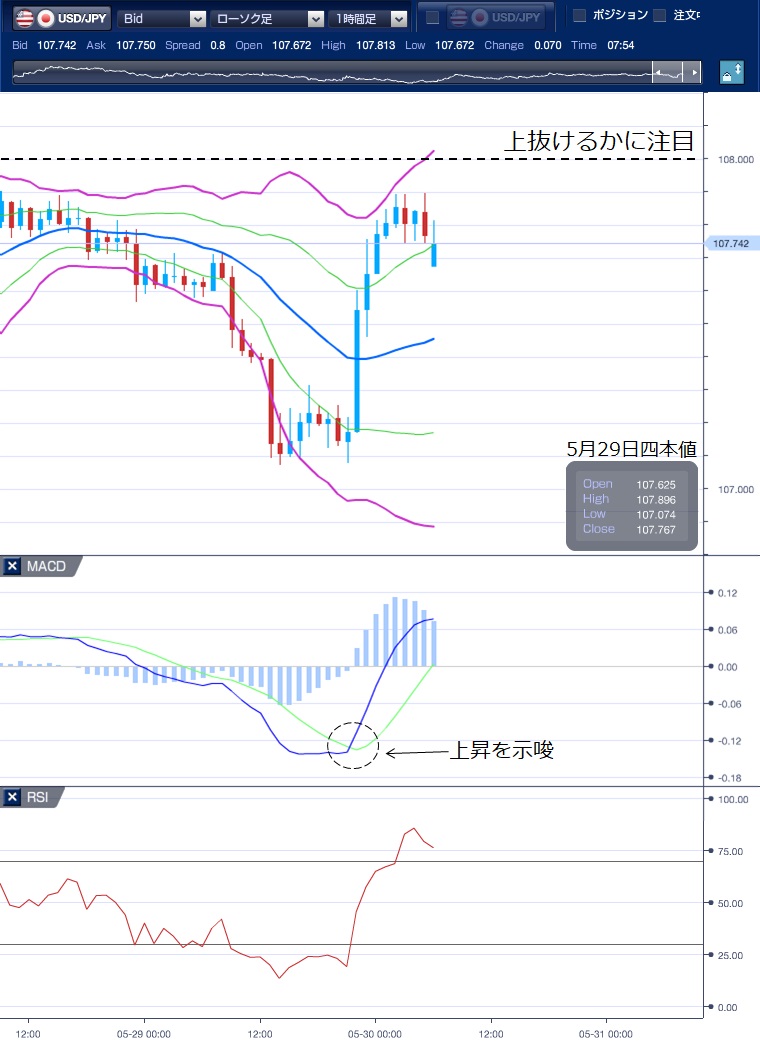 先週末(5月29日)のドル円相場は、下落後反発し、5月28日高値と面合わせとなりました。 東京時間に5月18日以来の安値となる107.07円まで下落したものの、NY時間のトランプ発言を受け、107.89円まで急反発し、5月28日高値に面合わせしました。 東京市場のドル円は軟調に推移。107.62円でオープンした後、月末による本邦輸出企業からのドル売りが目立ち、5月18日以来の安値となる107.07円まで下落しました。 欧州市場に入ってからは、107.10円〜107.30円と狭いレンジでもみ合いとなりました。 NY時間に入り、ロンドンフィキシングにかけドル買いが強まったことやトランプ米大統領の中国に関する意見を控えて、ドル売りの買い戻しが入り、107.89円まで急反発し、前日高値(107.90円)に面合わせとなりました。 テクニカル(ドル円一時間足チャート)でみると、21時台にMACDがシグナルを上抜けゴールデンクロスし、22時にドル円が急騰し、大きく上昇しました。 本日は、5月26日から5月29日の高値107.90円台の上値の抵抗帯を超えるか否かに注視したい。 ※チャートは、ドル/円の一時間足ボリンジャーバンドRSIMACDを表示しています。