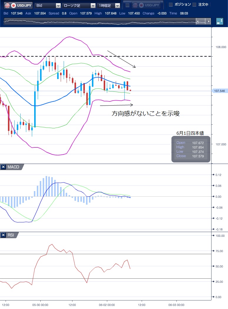 昨日(6月1日)のドル円相場は、107.60円を挟んでもみあいの展開となりました。 東京市場のドル円は107.70円水準でオープンした後は軟調に推移。米中対立や米国内での激化する抗議デモへの警戒感から時間外のNYダウ先物が下落して始まると、ドル売り優勢となり107.51円まで下落しました。 欧州市場のドル円は底堅く推移。「中国が米国産大豆の一部輸入を停止する可能性」との報道をきっかけにドル売りが加速し、一時107.37円まで下落し、前日安値と面合わせしました。しかし、107円台前半ではドル買い意欲も強く、ショートカバーが優勢になると107.76円まで持ち直しました。 NY市場のドル円は方向感なく推移。米国内で広がる抗議デモの行方や米中関係を巡る続報を待ちたいとの見方から様子見ムードが強く、22銭(107.53〜107.75円)と狭い値幅での推移となりました。 なお、注目されていた米ISM製造業景況指数は43.1と、予想の43.5とほぼ変わらなかったことから市場への反応は見られませんでした。 テクニカル(ドル円一時間足チャート)でみると、ボリンジャーバンドがスクイーズの形状となっており、MACDとシグナルがゼロライン付近で推移していることから、相場に方向感がないことが示唆されています。 ドル円は上値が重い展開が続いており、今後も米中対立激化と全米デモへの警戒感が上値を抑える要因となることが予想されます。本日も、5月26日から続いている高値107.90円台の上値の抵抗帯を超えるか否かに注目です。 ※チャートは、ドル/円の一時間足ボリンジャーバンドRSIMACDを表示しています。