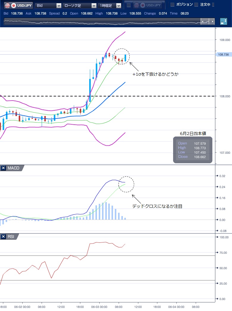 昨日(6月2日)のドル円相場は急伸。5月26日〜5月29日に何回もつけて、超えられなかった高値107.95円を上抜けたことで、ストップロスを巻き込みながら4月9日以来となる108.77円まで上昇しました。 東京市場のドル円は107.45〜107.83円と、38銭の値幅で方向感なく推移しました。 欧州市場に入っても同意に乏しく、107.67〜107.83円の狭いレンジで推移していましたが、NY勢が参入する21時前からドル円は急伸。 中国共産党の機関紙である環球時報(グロバールタイムズ)が前日の「中国が米国産大豆の一部輸入停止を検討」との報道を否定したほか、中国外務省もこの報道について「聞いていない」と表明したことを受け、米中対立への過度な警戒も後退し、経済再開への期待から各国で欧米株が上昇するなか、リスクオンの円売り優勢となりました。 5月19日以来、上値を抑えられていた108円を明確に上抜けると、断続的なストップロスを巻き込みながら、一時108.77円と4月9日以来約2カ月ぶりの高値をつけました。 テクニカル(ドル円一時間足チャート)でみると、ボリンジャーバンドではエクスパンションが発生しており、強い上昇トレンドの発生を示唆しています。 現在は 1σで下支えられ、上昇トレンドが継続していますが、MACDはシグナルを下抜けてデッドクロスするかどうかで、 1σを下抜けるかデッドクロスになるかに注視しています。 本日は21時15分に米ADP雇用統計、23時には米ISM非製造業景況指数など、注目度の高い経済指標の発表が控えています。 ※チャートは、ドル/円の一時間足ボリンジャーバンドRSIMACDを表示しています。