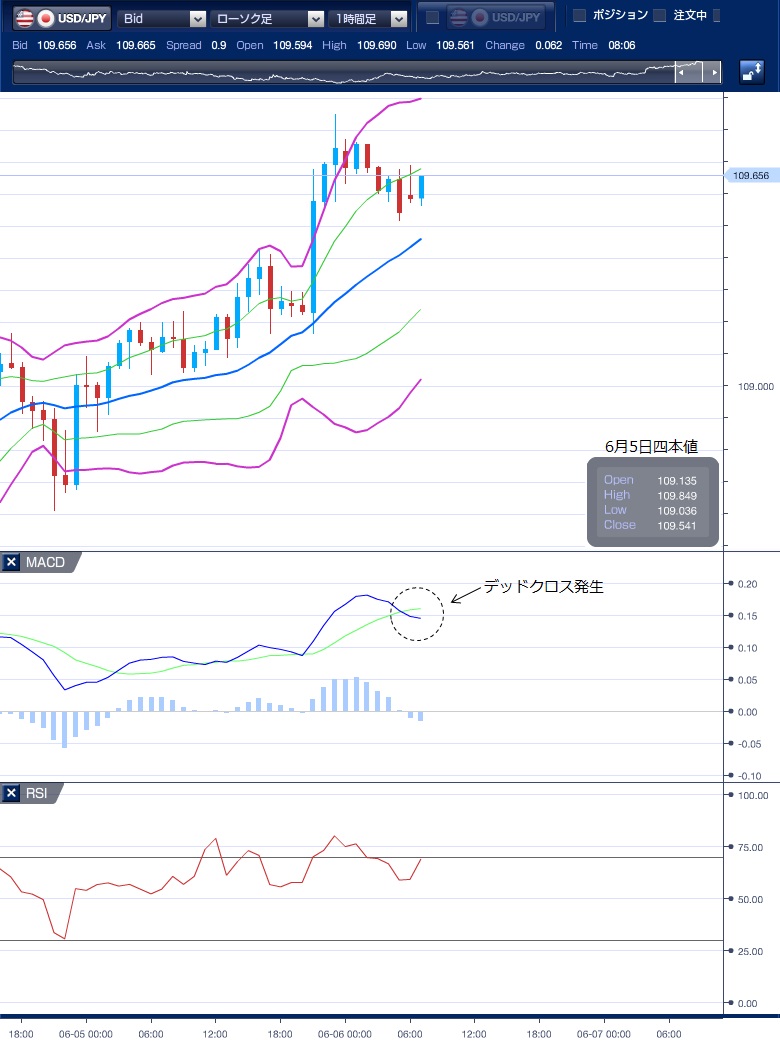 ドル円の前日の為替相場の動きを、各テクニカルで検証します。