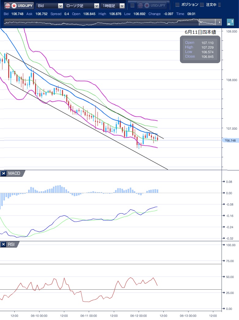 昨日(6月11日)のドル円相場は4日続落、一時106.57円と5月11日以来、約1カ月ぶりの安値をつけました。 東京市場のドル円は106.90〜107.23円で底堅く推移しました。 欧州市場に入りじり安となり、106.80〜107.14円での動きとなりました。 NY時間に入り、ドル売り優勢となり、一時106.57円と、5月11日以来約1ヵ月ぶりの安値を記録しました。 米国での新型コロナ感染者が200万人を超えたことから、新型コロナの第2波への懸念が強まり、NYダウが一時1500ドル超下落したことを受けてリスクオン相場でドル売り円買いが加速しました。 テクニカル(ドル円一時間足チャート)でみると、ボリンジャーバンドの全体が右肩下がりとなっており、また、6/9からチャネルラインの中で推移しているため、このチャネルラインと中心線を上抜けるかに注目です。 上値の目安:107.22円(6/11高値) 下値の目安:105.99円(5/7安値) ※チャートは、ドル/円の一時間足ボリンジャーバンドRSIMACDを表示しています。