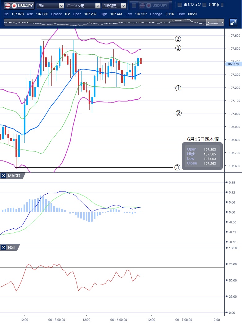 昨日(6月15日)のドル円相場は、107.00〜107.58円でもみ合いとなりました。 東京市場のドル円は、目立った材料もなく、107.00〜107.34円で終始しました。 欧州市場とNY市場も動意に乏しい展開となり、107.20〜107.49円と狭いレンジで推移しました。 テクニカル(ドル円1時間足チャート)でみると、ボリンジャーバンドの―2σがサポートとして機能したことで反発していたことが分かります。 現在はボリンジャーバンドの中心線が上向きになっていることから、上昇を示唆しているため、レジスタンスライン①107.40円②107.56円を上抜けるか、サポート①107.20円②107.00円③106.58円を下抜けるかに注目です。 ※チャートは、ドル/円の一時間足ボリンジャーバンドRSIMACDを表示しています。