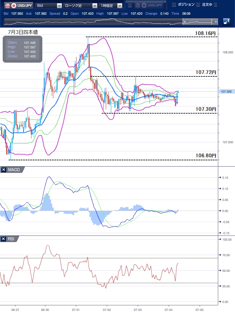 先週末(7月3日)のドル円相場は、米国市場が独立記念日の振替休日で為替を除いて休場のなか、新規の手掛かり材料にも乏しく、107.40〜107.56円と僅か16銭の狭いレンジで推移しました。 東京市場や欧州市場では、米国が休場では流動性に期待できないとして、売買を控える参加者が多く、107.43〜107.56円と13銭の狭いレンジで推移しました。 NY市場も動意に乏しい展開となり、107.40〜107.53円のレンジでもみ合いとなりました。 テクニカル(ドル円1時間足チャート)でみると、ボリンジャーバンドがスクイーズとなっており、中心線も横這いとなっていることから、もみ合いを示唆しています。 本日は、107.30〜107.72円でもみ合いになると考えます。 ただし、上記レンジをブレイクした場合は、抜けた方向に大きく動く可能性があるため、注目です。 ※チャートは、ドル/円の一時間足ボリンジャーバンドRSIMACDを表示しています。