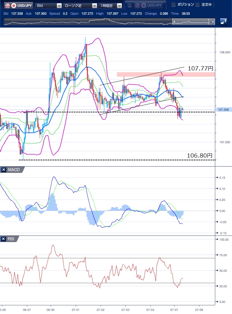 昨日(7月6日)のドル円相場は、11時ごろに107.77円まで上昇したものの、その後は反落し、6月29日以来、約1週間ぶりの安値となる107.25円を記録しました。 東京市場では107.42円で寄り付き後、時間外のダウ先物や日経平均株価などのアジア株式相場が総じて堅調に推移したことを受け、リスクオンのドル買い円売り優勢となり、一時107.77円まで上昇しました。 しかし、107円台後半では上値も重く、徐々にじり安となり107.54円まで下落しました。 欧州市場とNY市場でもドル売りは継続しました。 世界的な株高を受けてユーロドルが大きく上昇し、欧州通貨でのドル売りが対円でのドル売りに波及する形となったことで、6月29日以来、約1週間ぶりの安値となる107.25円を記録しました。 テクニカル(ドル円1時間足チャート)でみると、ボリンジャーバンドの中心線が右肩下がりとなっており、下落トレンドを示唆しています。 また、現在は-1σが抵抗帯となっており、上抜けるかに注目です。 本日は、106.80〜107.70円台でもみ合いになると考えます。 ただし、上記レンジをブレイクした場合は、抜けた方向に大きく動く可能性があるため、注目です。 ※チャートは、ドル/円の一時間足ボリンジャーバンドRSIMACDを表示しています。