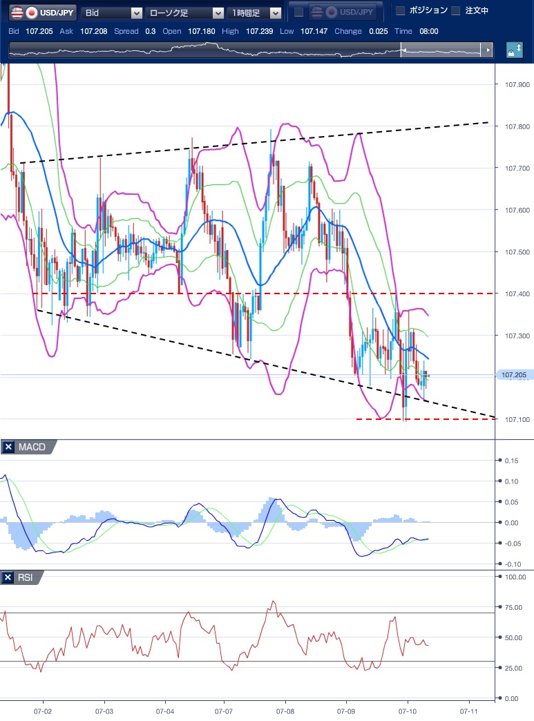 昨日(7月9日)のドル円相場は、107.09〜107.39円と、方向感に乏しく、僅か30銭で推移しました。 東京市場は、9時過ぎに107.18円と8日の安値に面合わせしたことでドルの買戻しが入り、107.36円まで上昇したものの、その後は方向感なく推移しました。 欧州市場に入ると、対欧州通貨などを中心にドルの買い戻しが進んだ流れを受けて、一時107.39円の高値をつけましたが、その後は欧米株安を背景にドル売り円買い優勢となりました。 NY勢参入後もドル売りは継続し、23時過ぎには一時107.09円と6月29日以来の安値を記録しました。 その後、引けに変えて反発し、107.18円でNYを引けしました。 テクニカル(ドル円1時間足チャート)でみると、ボリンジャーバンドの±2σが収斂しており、相場に方向感がないことを示唆しています。 また、前日に続きブロードニングフォーメーションを形成しているため、相場が上に行くか下に行くか迷っていることを示唆しています。 本日は10710円〜107.40円の昨日(7月9日)のレンジをブレイクできるかに注目です。 ※チャートは、ドル/円の一時間足ボリンジャーバンドRSIMACDを表示しています。