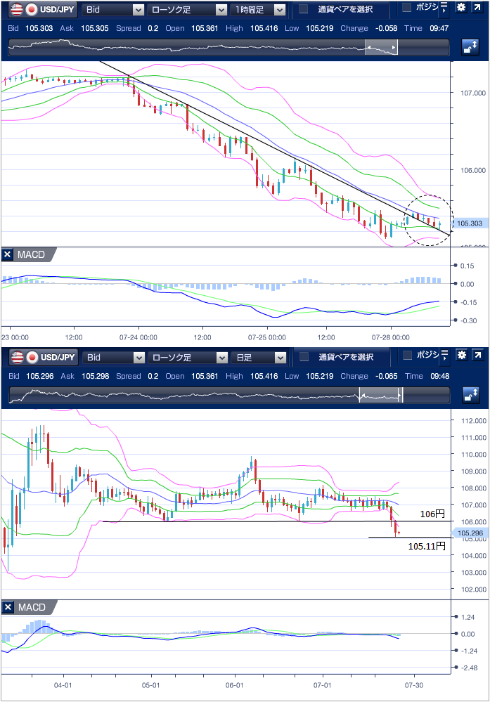 昨日(7月27日)のドル円相場は、3日続落。 東京市場は、106円手前でスタートしたものの、前週末の米中対立激化懸念によるドル売り円買いの流れが続き、105.38円まで下落しました。 海外勢参入後もドル売り円買い流れは継続。 米国の新型コロナウイルスの感染拡大や米中対立の激化を背景にしたドル売り円買い優勢の展開となり、23時過ぎに、3月13日以来、約4ヵ月半ぶりに105.11円まで下落しました。 テクニカル(ドル円1時間足チャート)でみると、ボリンジャーバンドは、±2αが収斂しており、下げ止まり且つ反発を示唆しています。また、7月23日から続くレジスタンスラインを上抜けたため、本日は反発する(105.11円〜106円)と考えています。 下値の目安は、105.11円(7/27安値)、105円、104.50円(3/13安値)、上値の目安は、105.45円、105.65円、106円(5/6安値近辺)。 ただし、105.11円(7/27安値)を下回り、105円割れた場合は、ストップを巻き込み、急落する可能性が高いため、注視したい。 ※チャートは、ドル/円の一時間足ボリンジャーバンドRSIMACDを表示しています。
