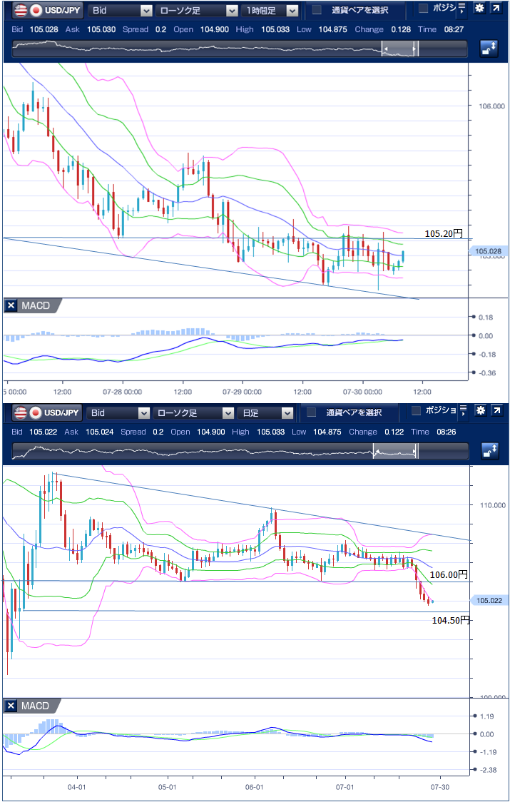 昨日(7月29日)のドル円相場は、5日続落。 FOMCの結果を受けて3月13日以来、4カ月半ぶりの安値104.77円まで急落しました。 東京市場は、ドル円は軟調。 日経平均株価がじり安となり、リスク回避の円買いで104.93円まで下落しました。 欧州市場は、ドル円は反発。 東京時間の流れを引き継ぎリスク回避の円買いから下落したものの、利食いの買戻しで105.20円まで値を戻しました。 NY市場では、FOMCの結果は市場予想通り金利の誘導目標を0.00-0.25%に据え置きを発表。その後のパウエルFRB議長の声明で「新型コロナウイルス感染拡大の影響からの景気回復に向けてあらゆる手段を尽くす」との発言から低金利が当面続くとの見方でドル売りが優勢となり、一時104.77円と3月13日以来の安値を付けました。 その後はもみ合いとなり、104.90円でNY市場をクローズしています。 テクニカル(ドル円1時間足チャート)でみるとボリンジャーバンドは横ばいとなっており、 もみ合いを示唆しています。 日足チャートで見るとエクスパンションからバンドウォークを形成しており、強い下落トレンドを示唆しています。本日はさら下値を試すか、反発するかを注視したい。 ※チャートは、ドル/円の一時間足ボリンジャーバンドRSIMACDを表示しています。