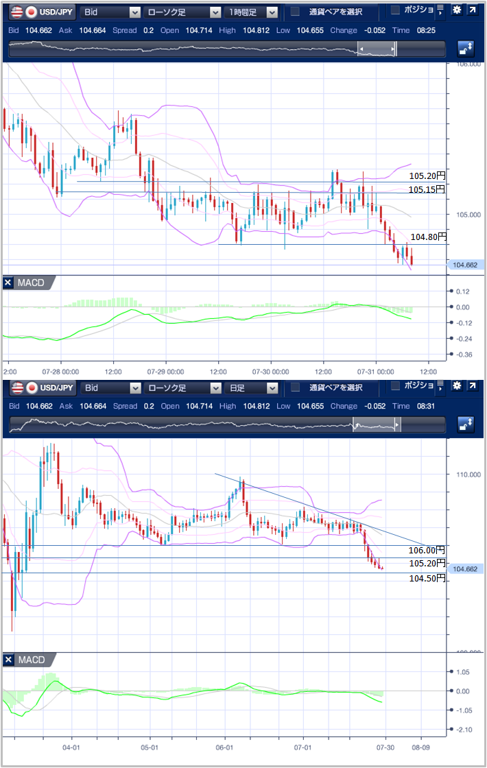 昨日(7月30日)のドル円相場は、6日続落。 米経済不透明感からドル売り円買い優勢となり、前日安値を下抜け3月13日以来の104.67円まで下落しました。 東京市場のドル円は104.90円からスタート。利食いの買い戻しが入り、前日高値を更新し一時105.29円まで上昇しました。しかし、前日高値の105.20円台では売り圧力が強く、105.29円が30日の高値となりました。 欧州市場は、方向感に乏しく104.99円〜105.20円の21銭幅で推移しました。 NY市場でドル円は急落。 21時30分に発表された4-6月期米GDP速報値が過去最大の下落幅となったことを受けて米景気の先行き不透明感が強まり、ドル売り円買いが加速。3月13日以来の安値を更新し104.67円まで下落しました。 テクニカル(ドル円1時間足チャート)でみるとボリンジャーバンドはエクスパンションを形成していることや日足チャートでもエクスパンション且つバンドウォークを形成していることから強い下落トレンド中であることを示唆しています。 以上のことから、本日も戻り売り優勢とみられる。 ただし、以前より記載している重要なサポートラインの104.50円前後(3月17日安値、2019年8月16日安値、同年1月3日安値)があるため、104.40円〜104.60円を下抜けるか否かに注目です。 なお、下抜けた場合はストップを巻き込み急落する可能性が高いことと、下抜けなかった場合は反発する可能性が高いで注視したい。 ※チャートは、ドル/円の一時間足ボリンジャーバンドRSIMACDを表示しています。