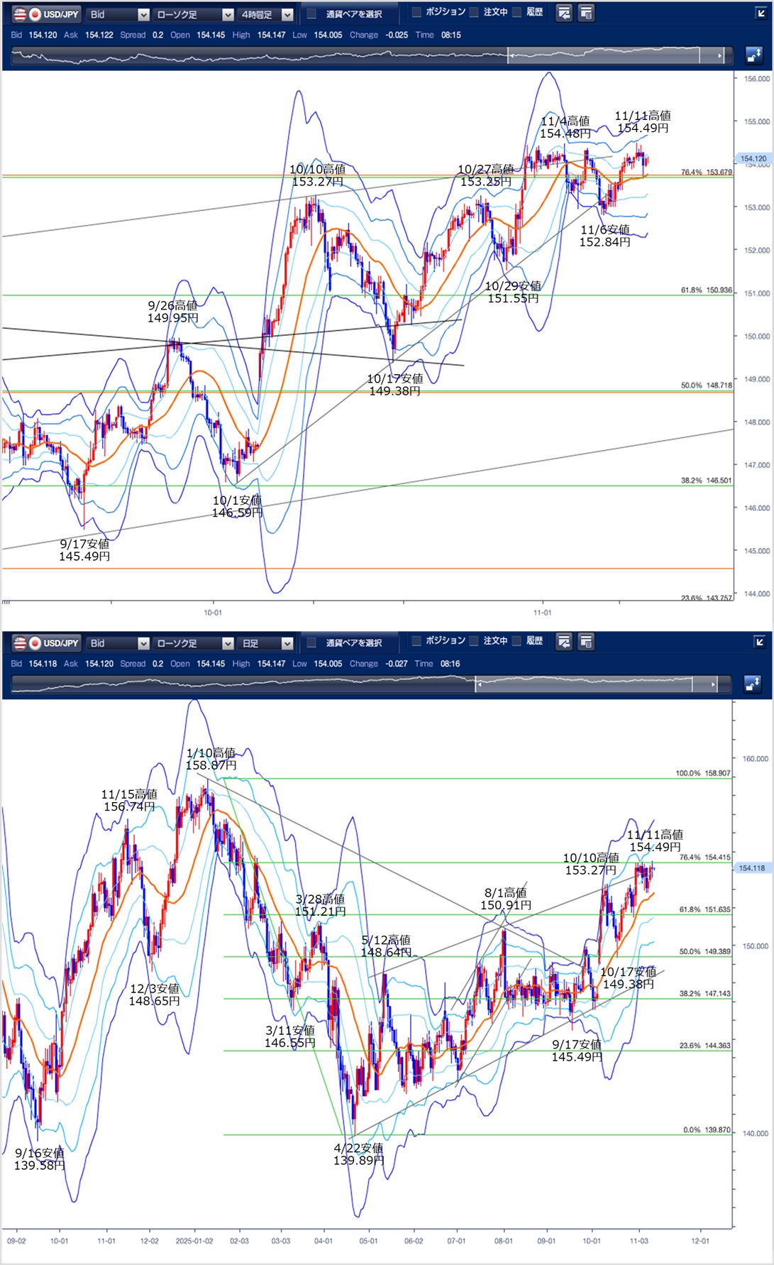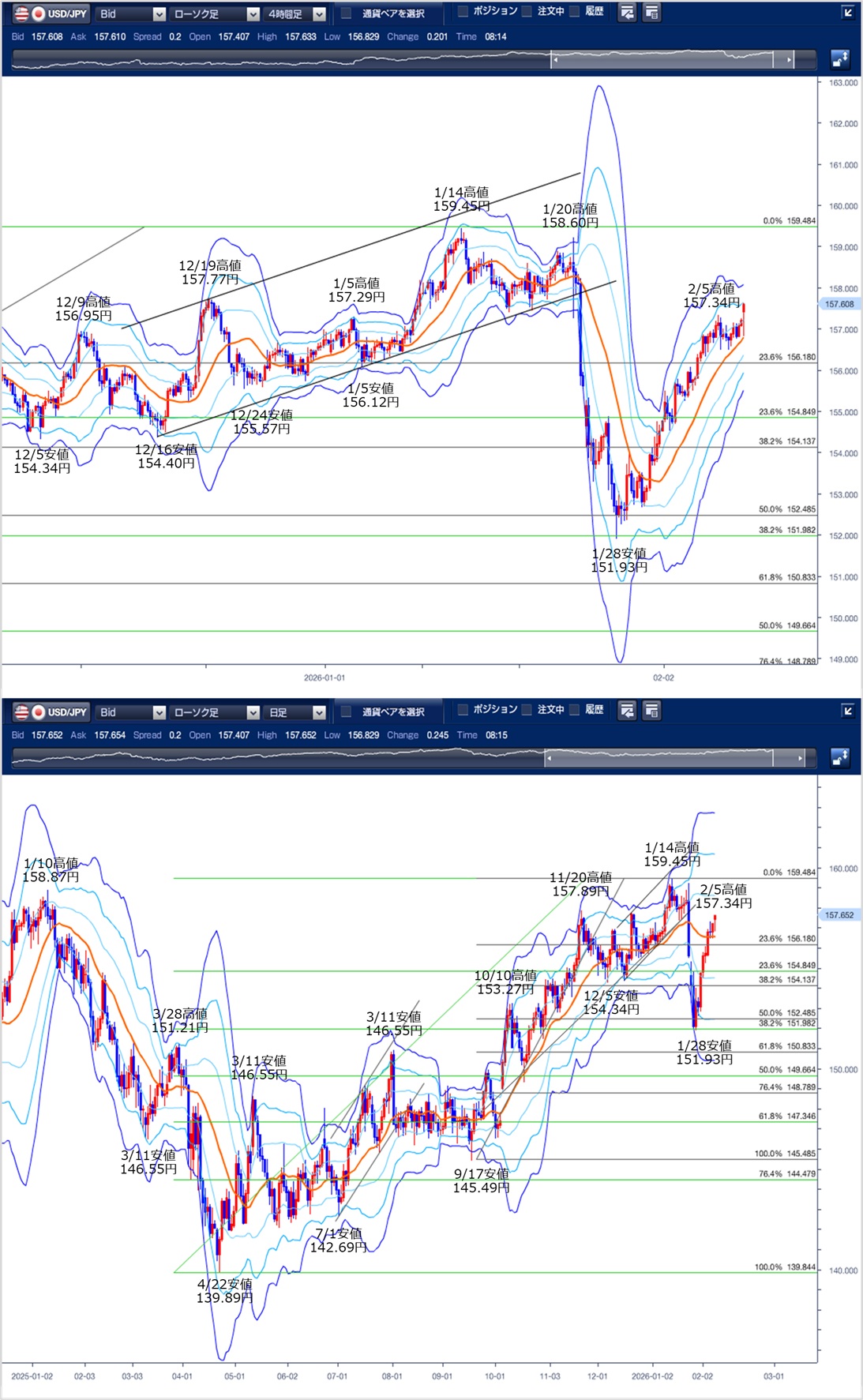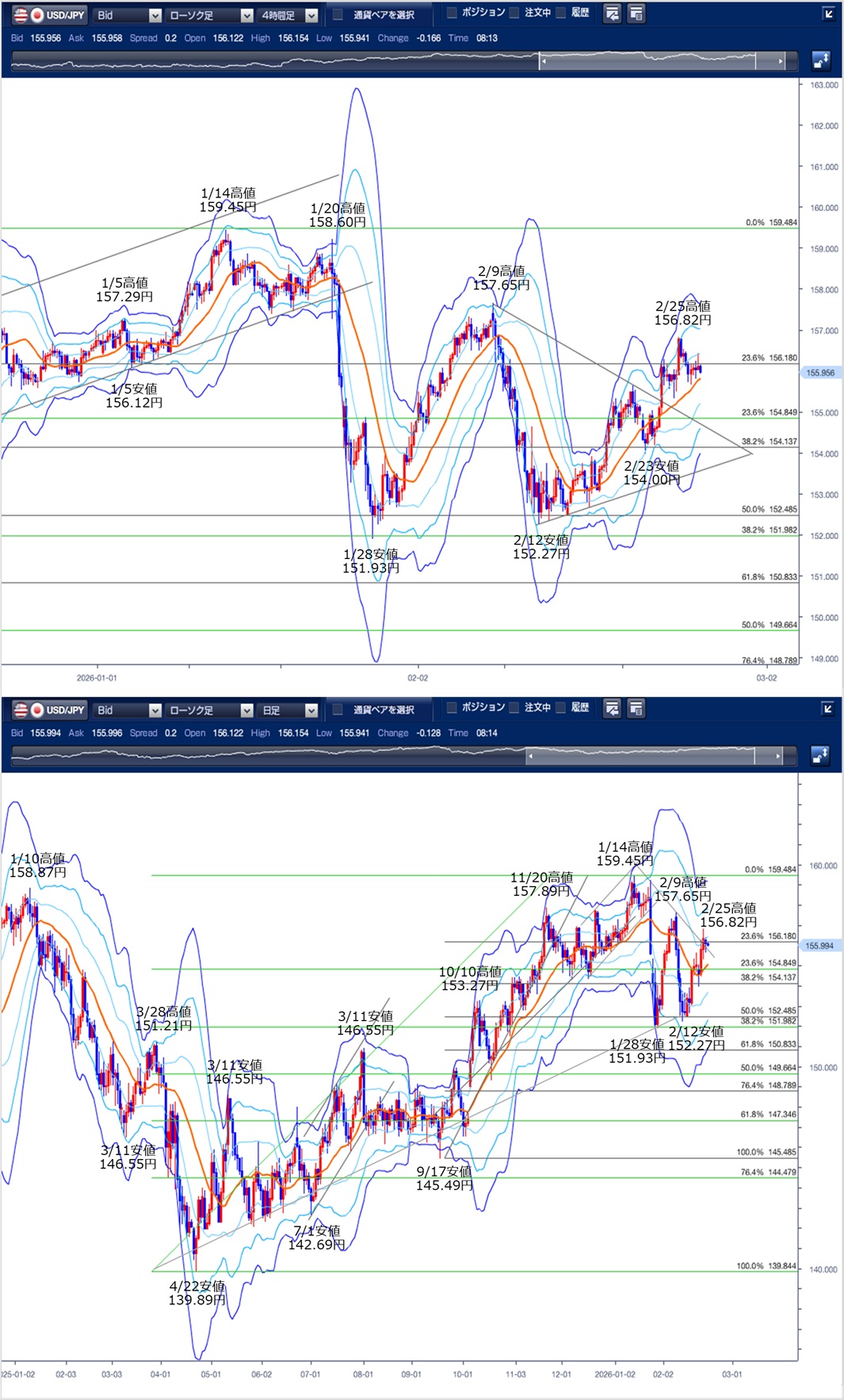 ドル円の前日の為替相場の動きを、各テクニカルで検証します。