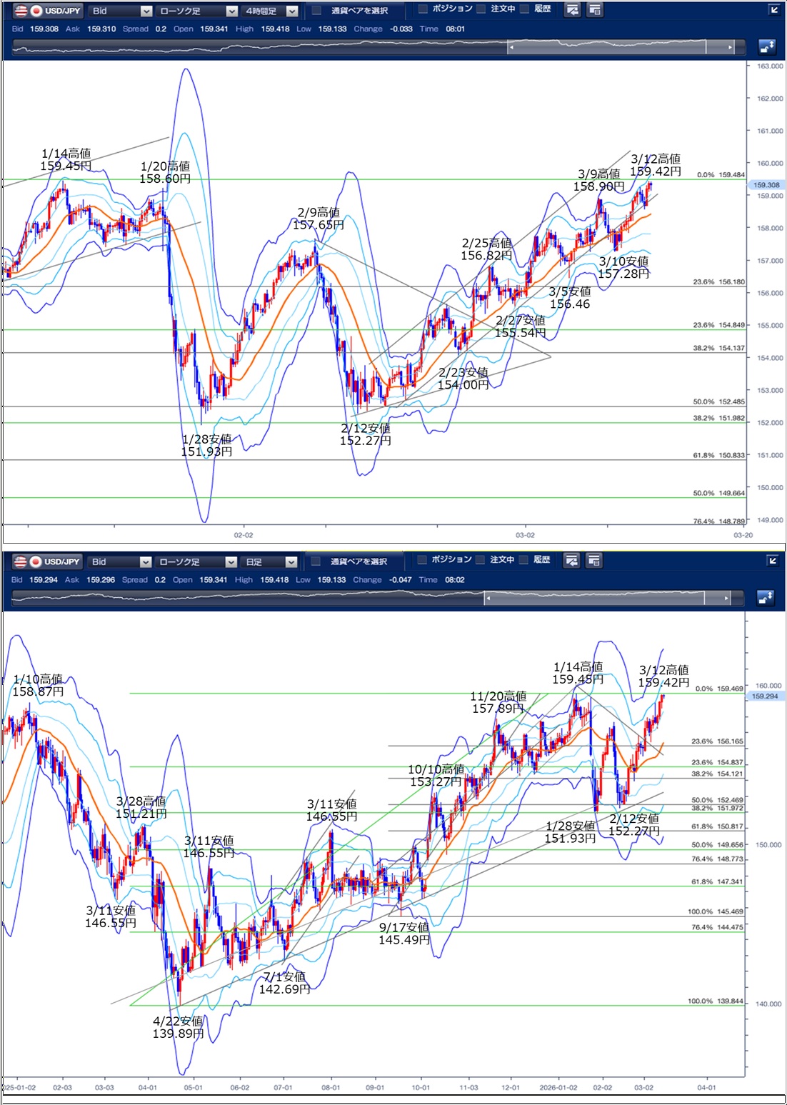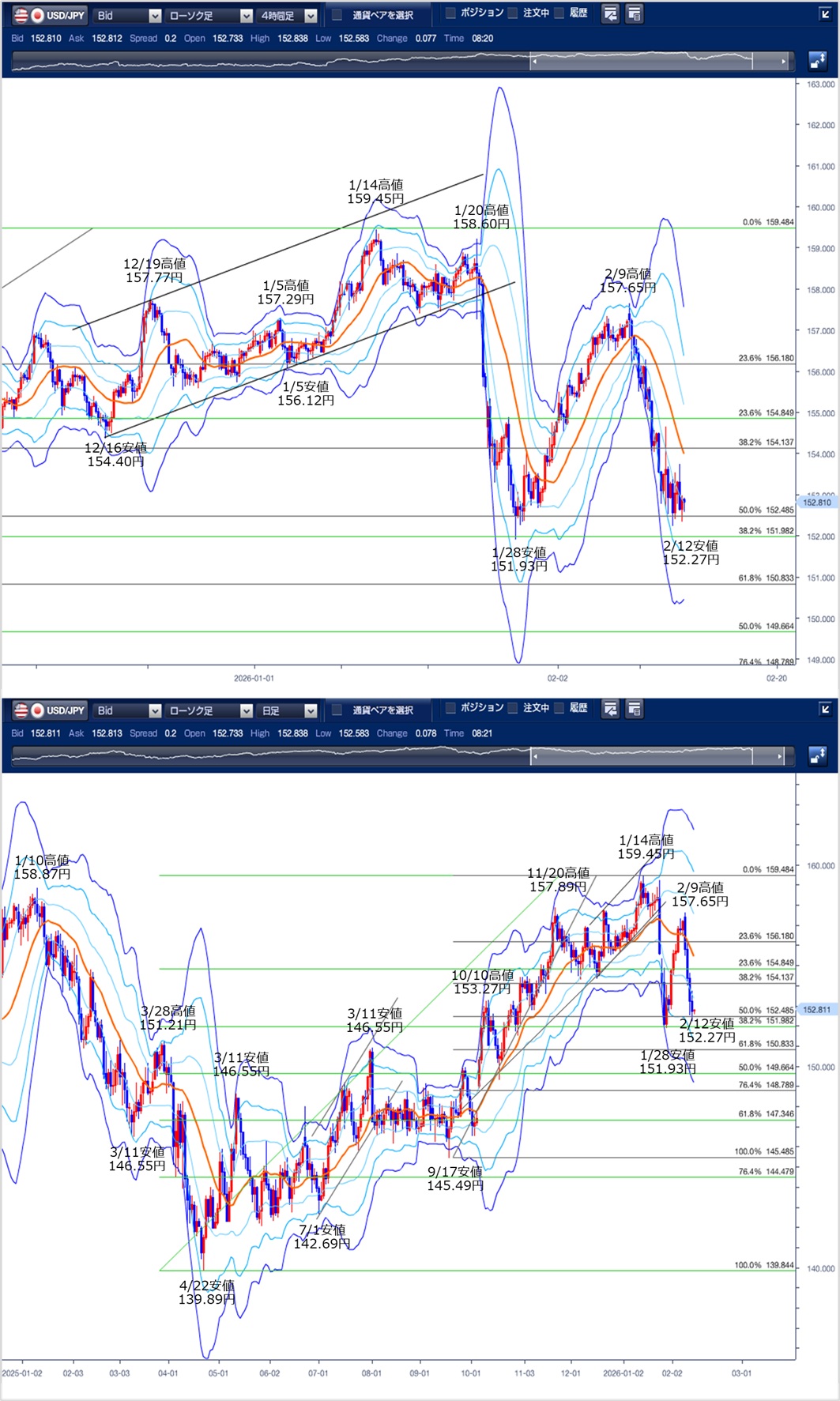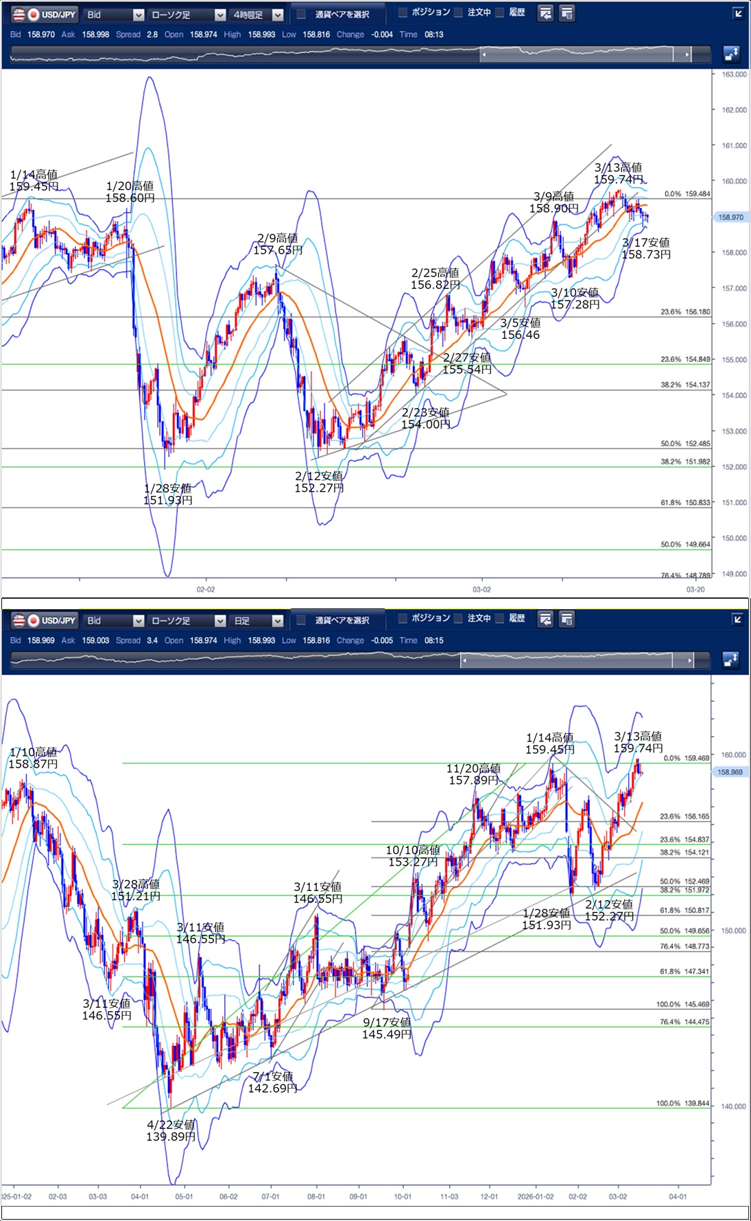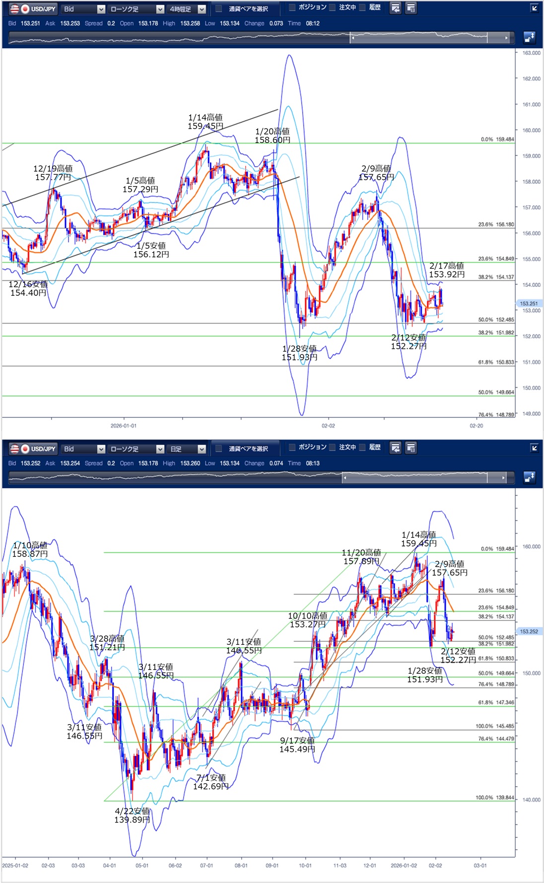 ドル円の前日の為替相場の動きを、各テクニカルで検証します。