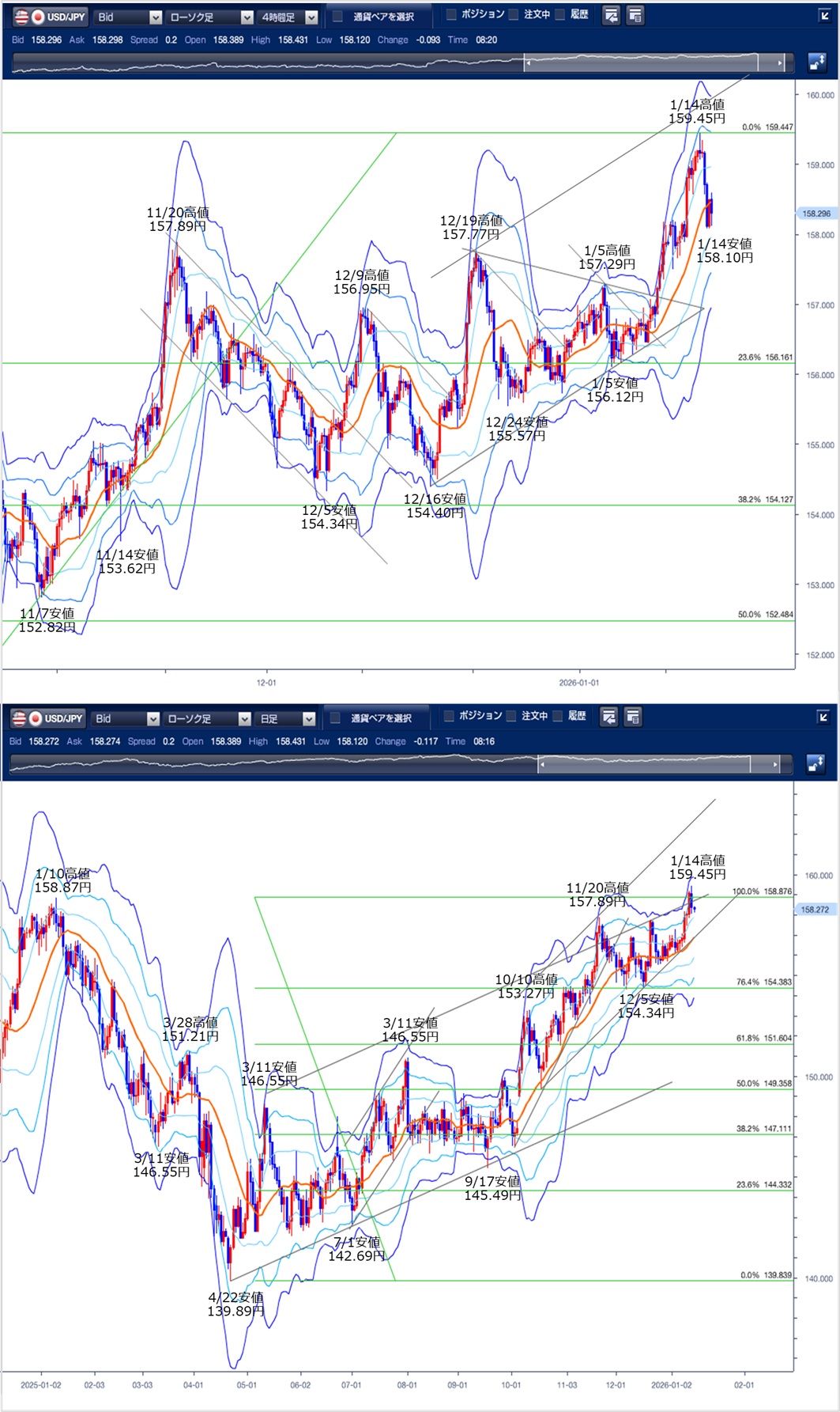 昨日(1月14日)のドル円は、7日ぶりに反落。 政府・日銀による為替介入への警戒感が高まるなか、立憲民主党と公明党による新党結成の報道を受け、ドル売り円買いが優勢となり、158.10円まで下落しました。 東京市場はもみ合い。 衆議院の解散総選挙がほぼ確実視されるなか、日経平均株価が連日の大幅高となったことを受けてドル買い円売りが優勢となり、159.45円まで上昇しました。ただ、2024年7月12日高値159.45円が意識されると利食い売りが優勢となり、159.09円まで下落しました。その後は押し目を拾いたい向きもあり、159.34円まで値を戻す展開となりました。 欧州市場は下落。 片山財務相による「行き過ぎた動きに対しては、あらゆる手段を排除せずに適切な対応をとる」の発言や、三村財務官による「一方的かつ急激な動きも見られ極めて憂慮している」との円安けん制発言を受け、政府・日銀による為替介入への警戒感が高まり、ドル売り円買いが優勢となり、158.58円まで下落しました。 NY市場はもみ合い。 「立憲民主党と公明党が新党結成を視野に調整している」との一部報道を受け、日経平均先物の急落とともにドル売り円買いが優勢となり、158.17円まで急落しました。その後すぐに158.74円まで切り返したものの、ベッセント米財務長官が「為替市場の過度な変動は望ましくない(対ウォン)」と発言したことを受け、再び158.10円まで下落しました。 その後は前日安値157.90円が意識されたことで一転ドル買戻しが優勢となり、158.59円まで反発する展開となりました。 ==========================